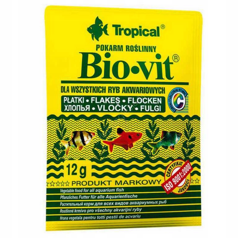 Основні пластівці рослинного походження. Основний рослинний корм у формі пластівців. Призначений для щоденного годування травоїдних риб, а також рекомендований як прикорм для всеїдних риб. Оптимально збалансований склад і відповідний набір вітамінів і мікроелементів забезпечують правильний ріст і розвиток риб, при цьому задовольняючи їх енергетичні потреби. Високий вміст баластних речовин забезпечує правильну роботу надзвичайно довгого шлунково-кишкового тракту травоїдних риб, а риби, яких регулярно годують кормом Bio-vit, не піддаються запорам і небезпечним запаленням травного тракту. Щоб забезпечити рослиноїдних риб різноманітним раціоном, Bio-vit можна використовувати разом з іншими рослинними кормами, наприклад, овочами, пластівцями спіруліни тощо.
