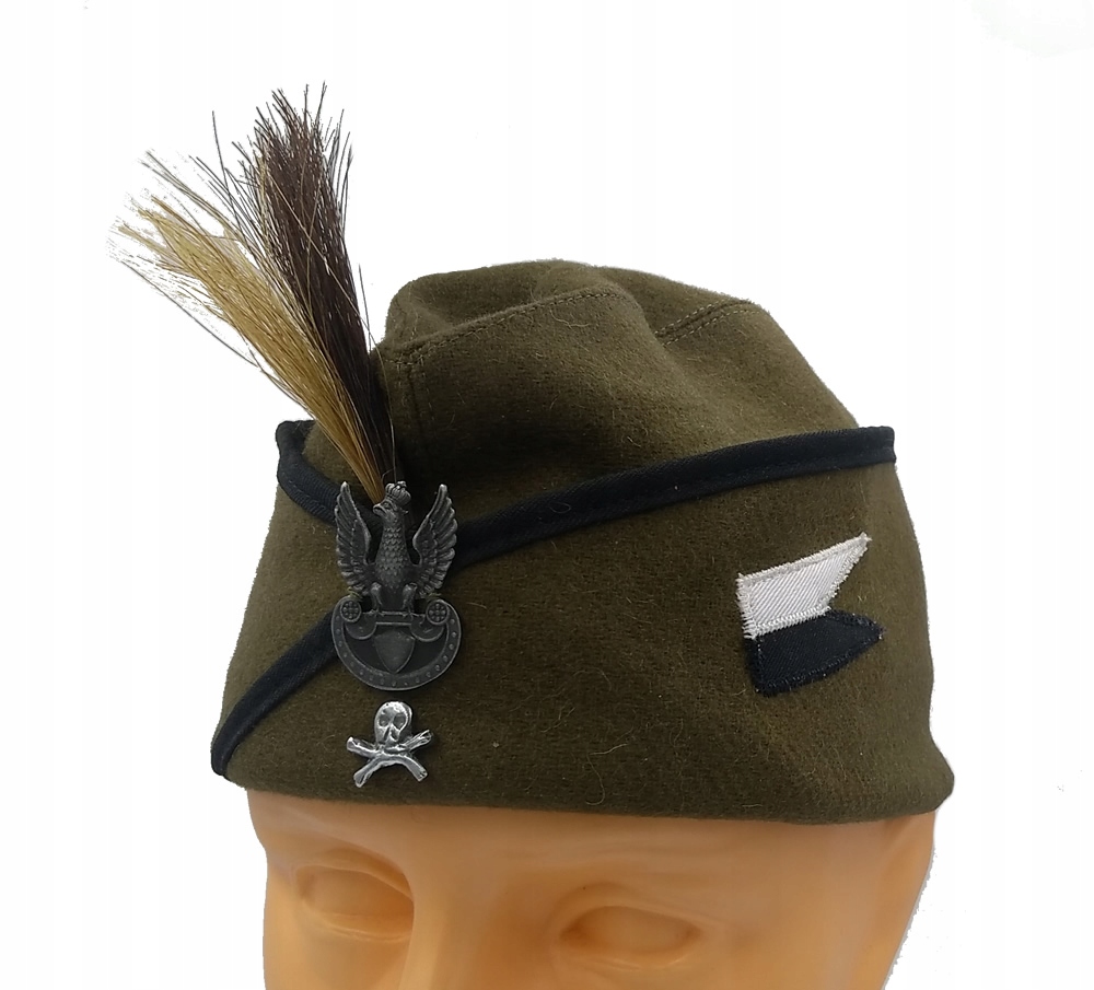 Шапка М 19 тільки з доданою чорною окантовкою та хвостиком з кінського волосу спереду між вушанкою та кашкетом. Малий орел wz 17 під ним череп totenkopf. З лівого боку пришитий чорно-білий вимпел.