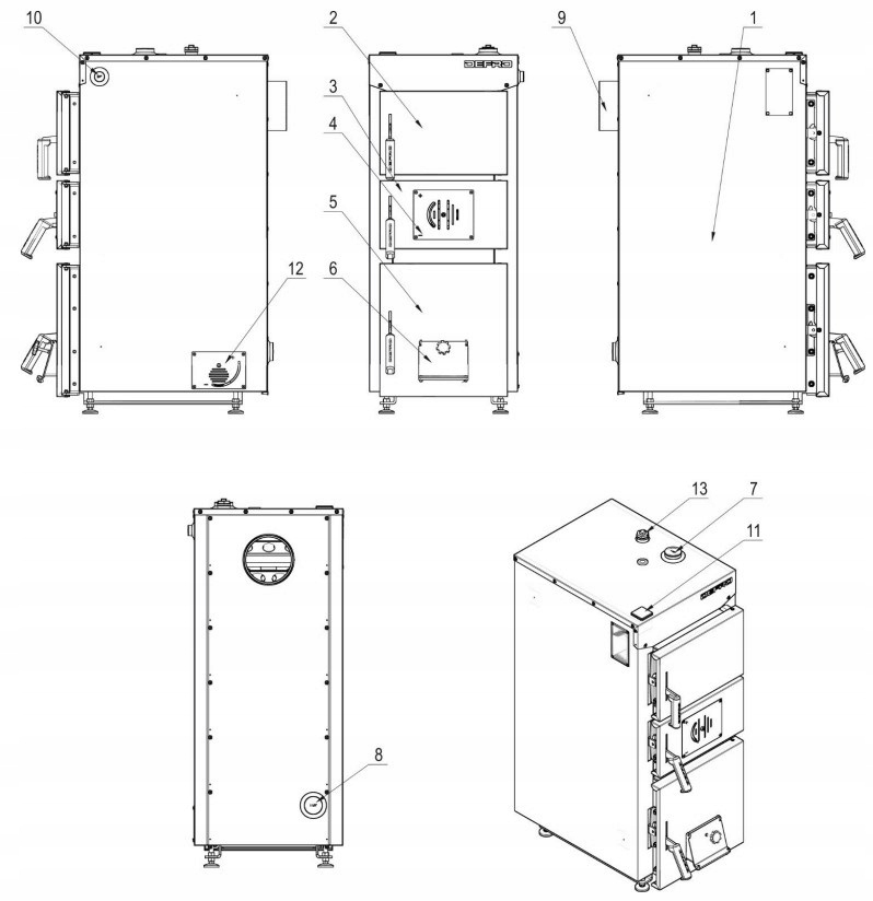 8: обратка, 9: димохід, 10 : b> інсталяційний роз'єм для регуляторів печі (регулятор тяги) 11: аналоговий термометр,