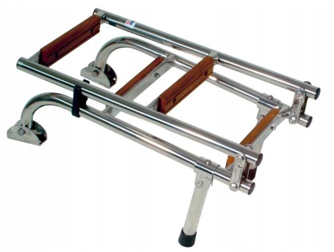 КОРМОВИЙ ТРАП ДЛЯ ЯХТИ АБО МОТОРНОГО ЧОВНА 4 СТУПЕНЯ - Високоякісна розкладна чотириступенева драбина з нержавіючої сталі А4 (полірована) для яхти, човна чи моторного човна. Для підвищення безпеки та комфорту сходинки оснащені нековзкими накладками з тикового дерева. Драбину складають, піднімаючи нижню частину горизонтально або вертикально, паралельно верхній частині. Кріплення до вертикальної площини фрамуги