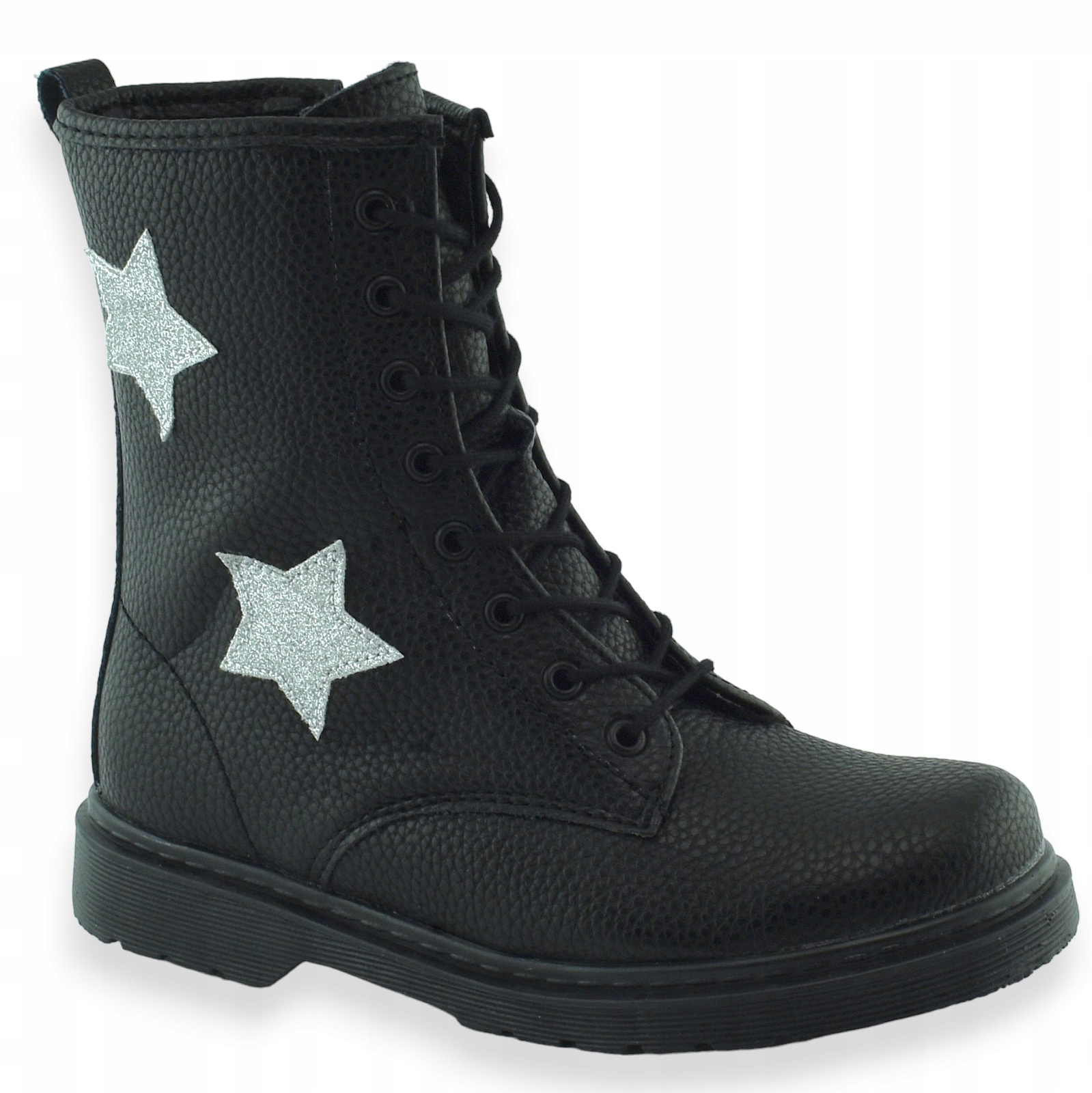 Зимові чоботи для дівчинки класичного чорного кольору на зав'язці спереду. Срібні зірочки збоку додають шарму. М'яка екошкіра та бічна блискавка полегшують надягання. Черевики Bovver стануть ідеальним доповненням до зимових образів дівчат.