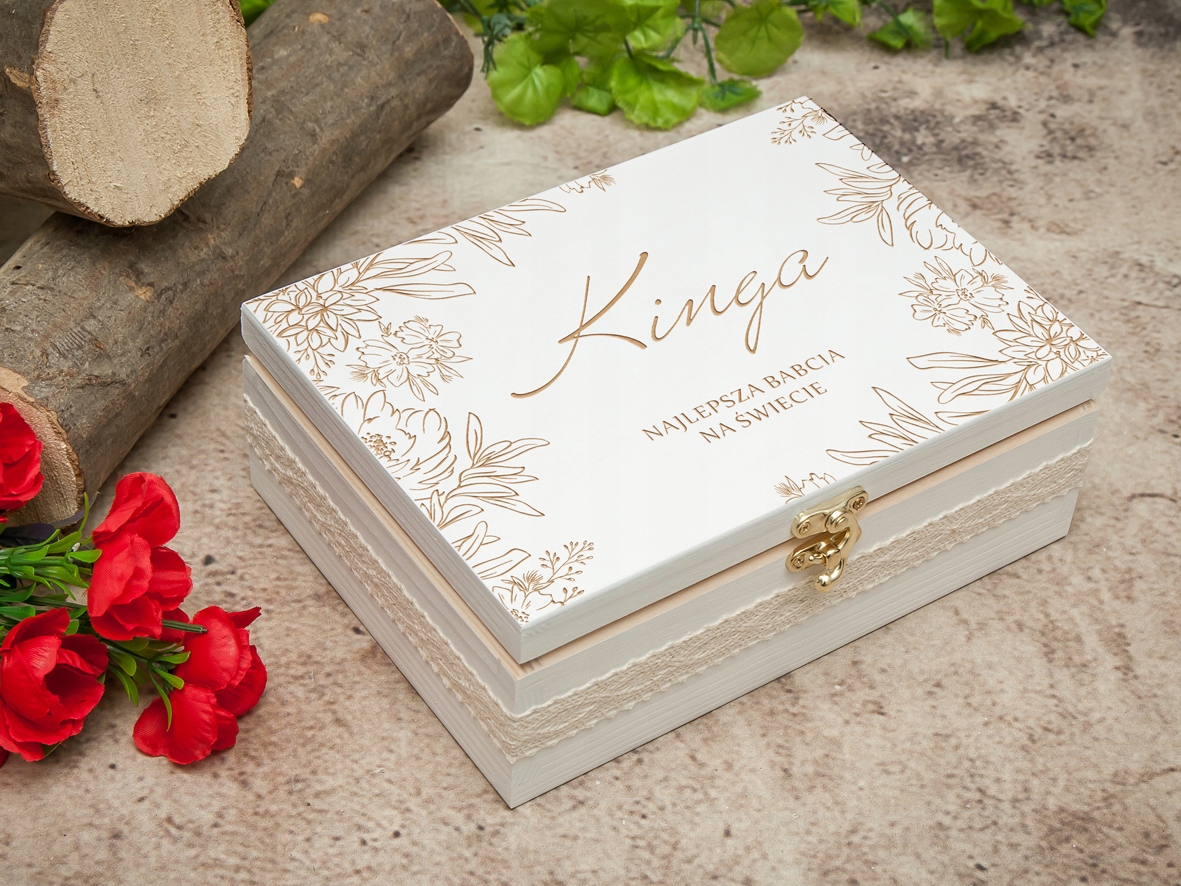 Коробка є виготовлена з дерева, прикрашена декоративним мереживом (вибирається довільно), закривається на елегантну застібку в стилі ретро.