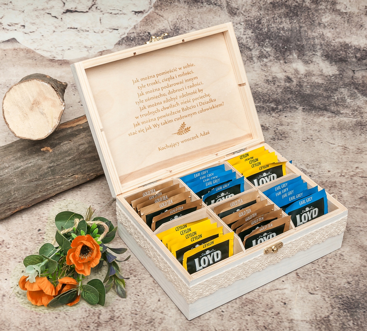 Дерев'яна підставка для чаю з чайним набором, гравіюванням імені та присвятою всередині - це готовий і практичний подарунок на будь-яке свято!