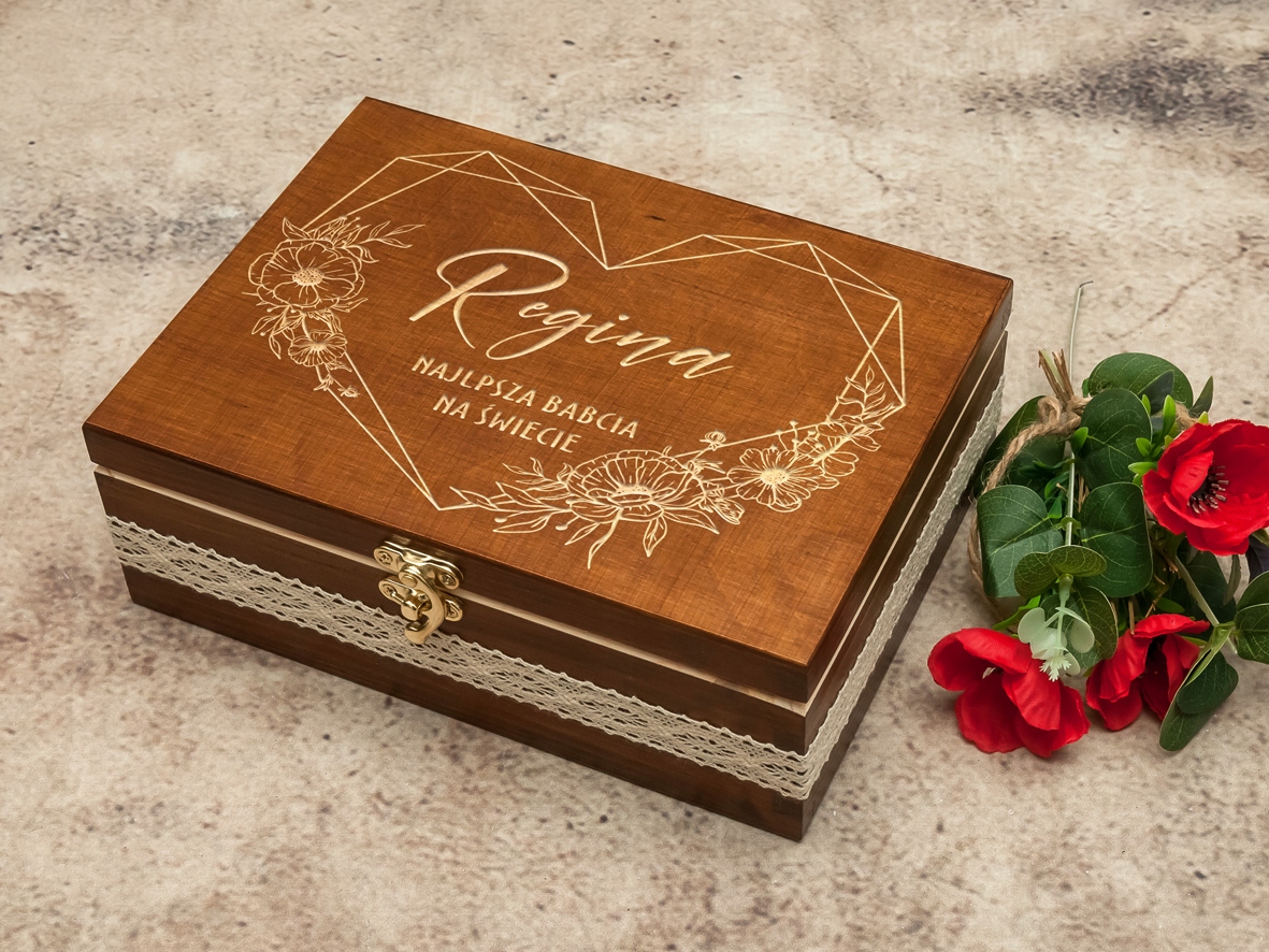 Коробка є виготовлена з дерева, прикрашена декоративним мереживом (вибирається довільно), закривається на елегантну застібку в стилі ретро.