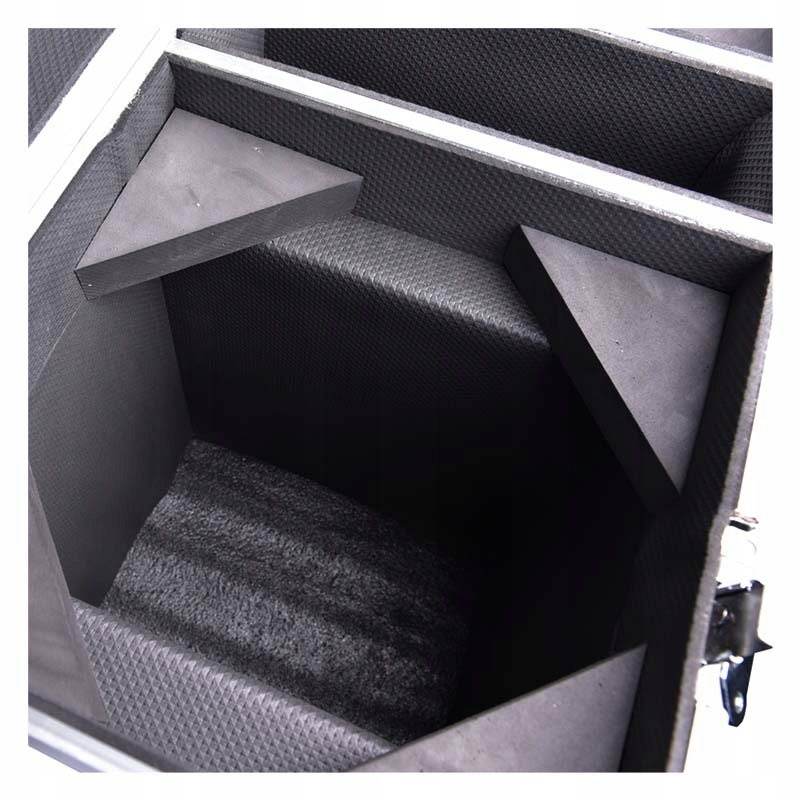LIGHT4ME ROBO ZOOM WASH 740 CASE - це чохол для зберігання та транспортування двох відбивачівRobo Zoom Wash 740, в який також вдало розмістяться інші b>освітлення сцениабо сценічне обладнання з розмірами, подібними до цих прожекторів. Корпус виготовлений з міцної товстої фанери, покритої водостійким стільниковим шпоном. Його краї та кути були укріплені суцільною арматурою. Кейс має чотири поворотних колеса (в тому числі два з замками) і дві ручки з боків, що дозволяє його зручно переносити. Кришка, що відкривається з одного боку, забезпечує зручний доступ до збережених пристроїв. Всередині чохла є два окремих відділення для фар і більш вузьке відділення для проводки або інших аксесуарів. Закривання-метелик роблять контейнер дуже добре захищеним від випадкового відкриття.