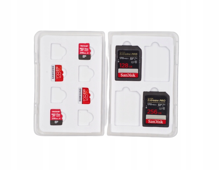 Надійна коробка для карт SD і micro SD. Формована частина з гнучкого поролону з відділеннями додатково захищає картки від механічних пошкоджень і надійно утримує картки, запобігаючи їх випаданню та переплутанню.