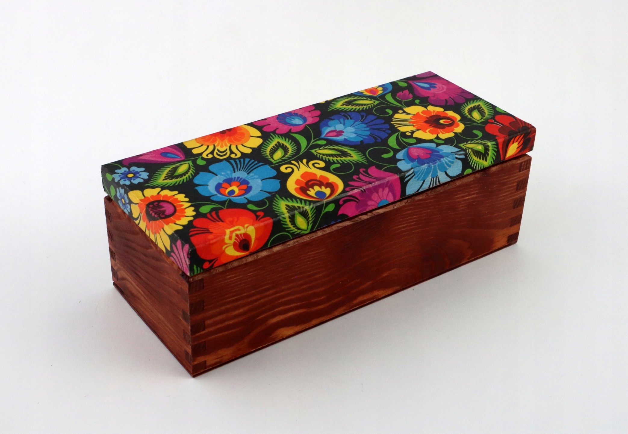 Одним із найхарактерніших елементів цієї коробки є візерунок Ловича. Ми використали барвистий квітковий візерунок, який чудово поєднується з відтінком рожевого дерева на чорному тлі. Цей візерунок додає коробці унікальний фольклорний характер.