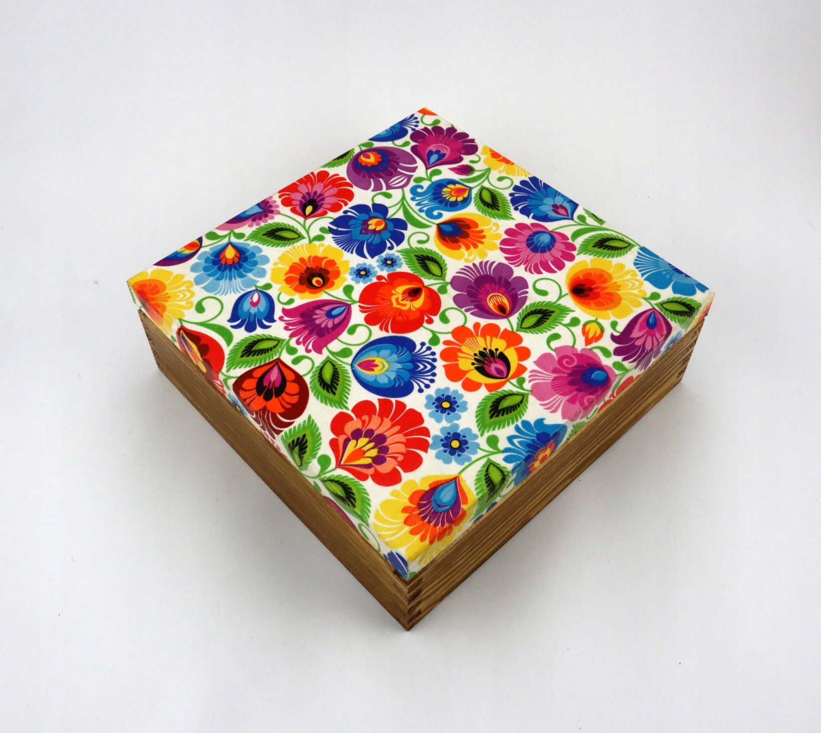 Одним із найхарактерніших елементів цієї коробки є візерунок Łowicz. Ми використали барвистий квітковий візерунок, який чудово поєднується з відтінком світлого дуба на білому тлі. Цей візерунок додає коробці унікальний фольклорний характер.
