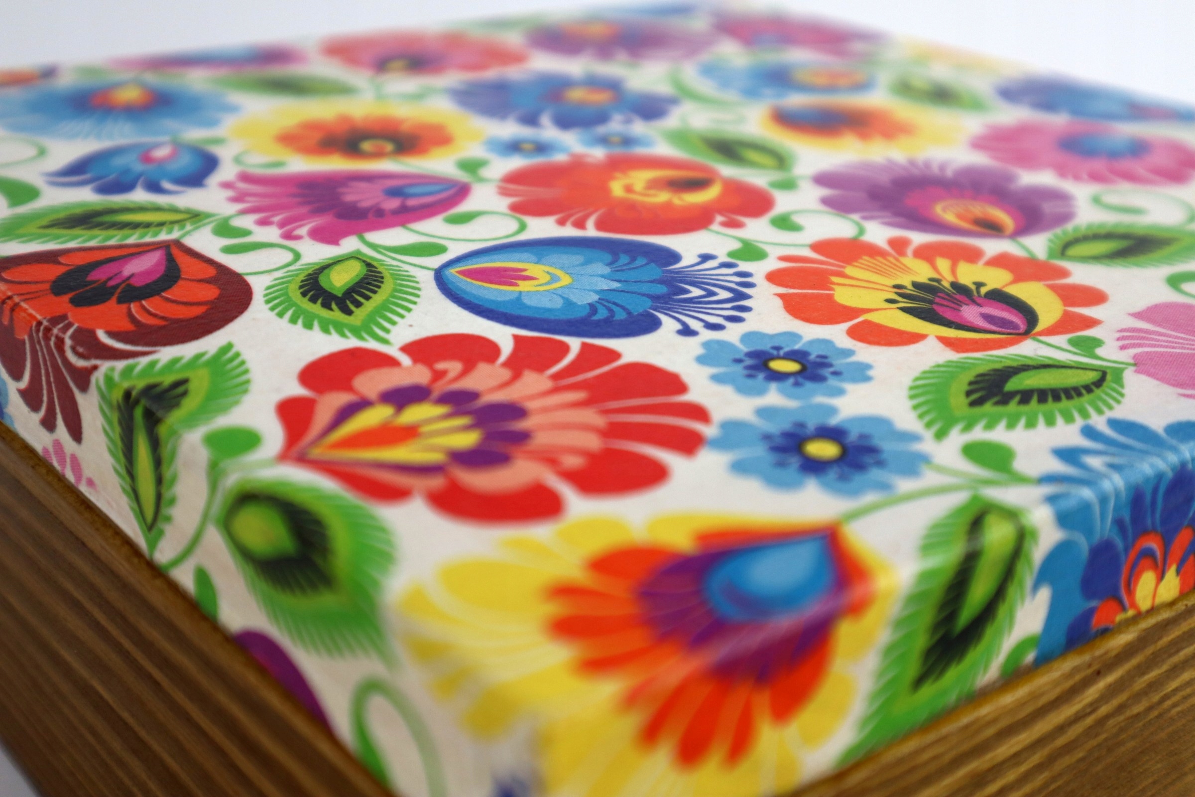 Одним із найхарактерніших елементів цієї коробки є візерунок Ловича. Ми використали барвистий квітковий візерунок, який чудово поєднується з відтінком світлого дуба на білому тлі. Цей візерунок надає скриньці унікальний фольклорний характер.