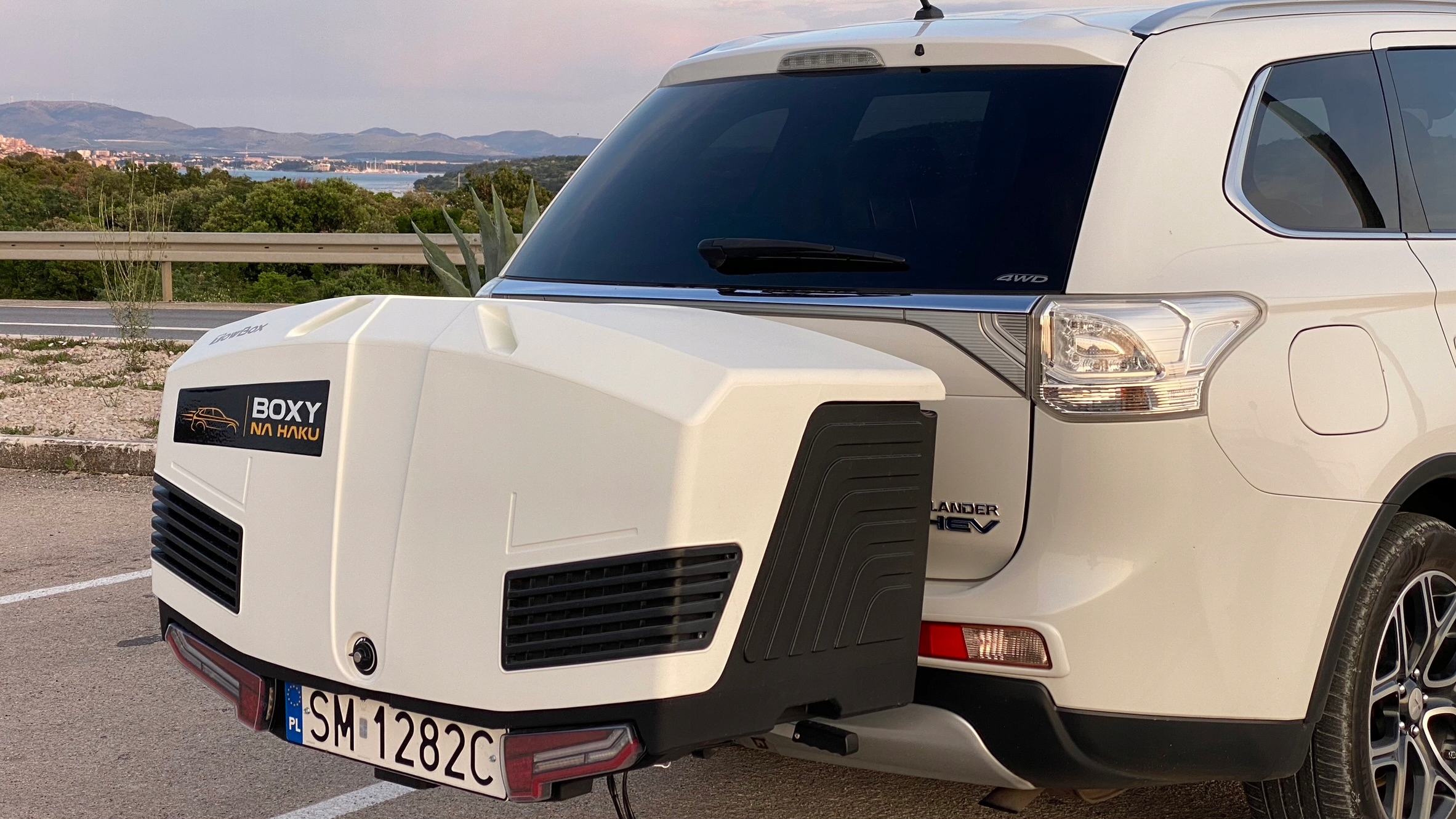 Towbox V3 — це готовий продукт, готовий до встановлення на гак прямо з коробки. Має опорну раму, інтегровану з навісним пристроєм, оснащену функцією нахилу під час переміщення боксу від автомобіля, що дозволяє відкрити задній люк і отримати доступ до багажника автомобіля без необхідності демонтажу боксу. Спеціальна конструкція рами дозволяє регулювати відстань між коробкою і кузовом, завдяки чому >також її можна використовувати в автомобілях із запасним колесом на двері багажника. Буксирувальна коробка має вбудовані колесадля легкого переміщення (її не потрібно піднімати) і збирання та розбирання, яке може легко зробити одна людина. Буксир має просту та зручну систему кріплення гака (за допомогою важеля), а функція втягування активується педаллю, розташованою в передній частині коробки.