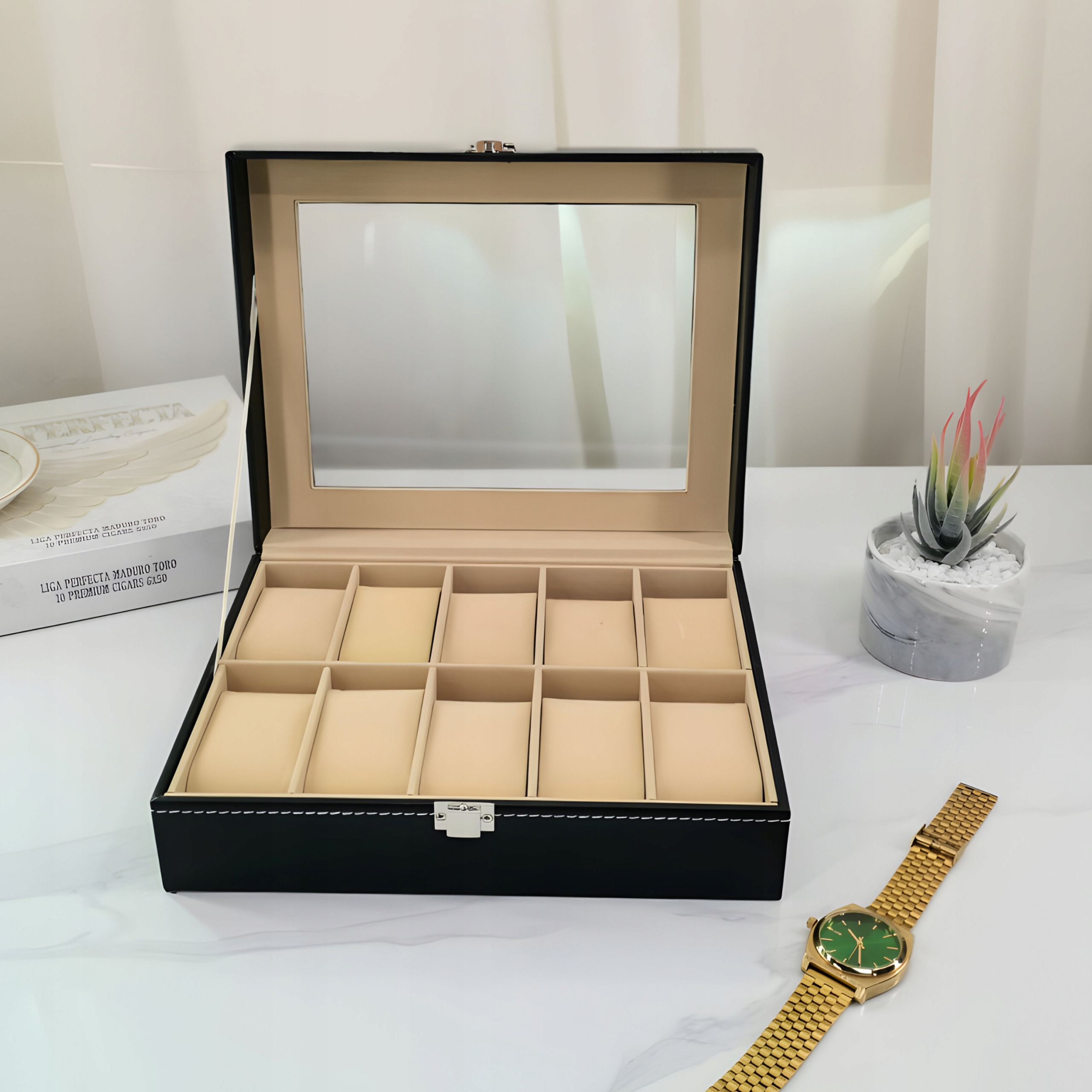 Watch Box, маючи 10 відсіків вражає не лише своєю функціональністю, але й з компактними розмірами 25,5 х 8 х 20,4 см . Це ідеальне рішення для колекціонерів, які цінують елегантність та практичність. P до 10 годинників , зберігаючи невеликі розміри, що дозволяє легко зберігати. Компактна конструкція не означає відставку від естетики.