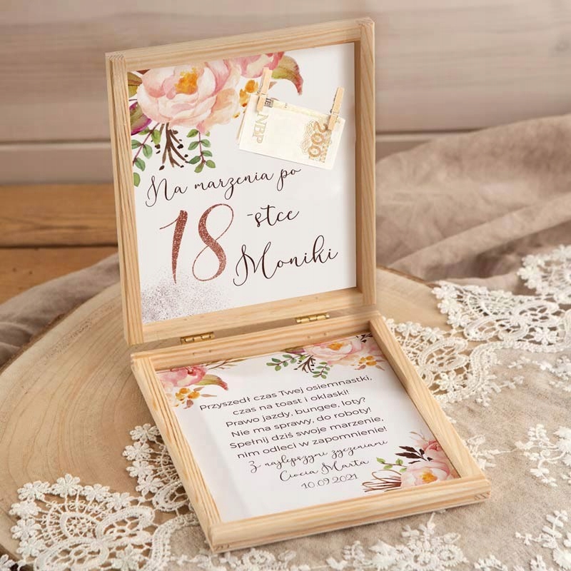 - композиція: персональна скринька, виготовлена спеціально для подарунка на 18-річчя; коробка містить дві персоналізовані картки з зображеннями та побажаннями, а також дерев'яні кліпси для фото чи грошей