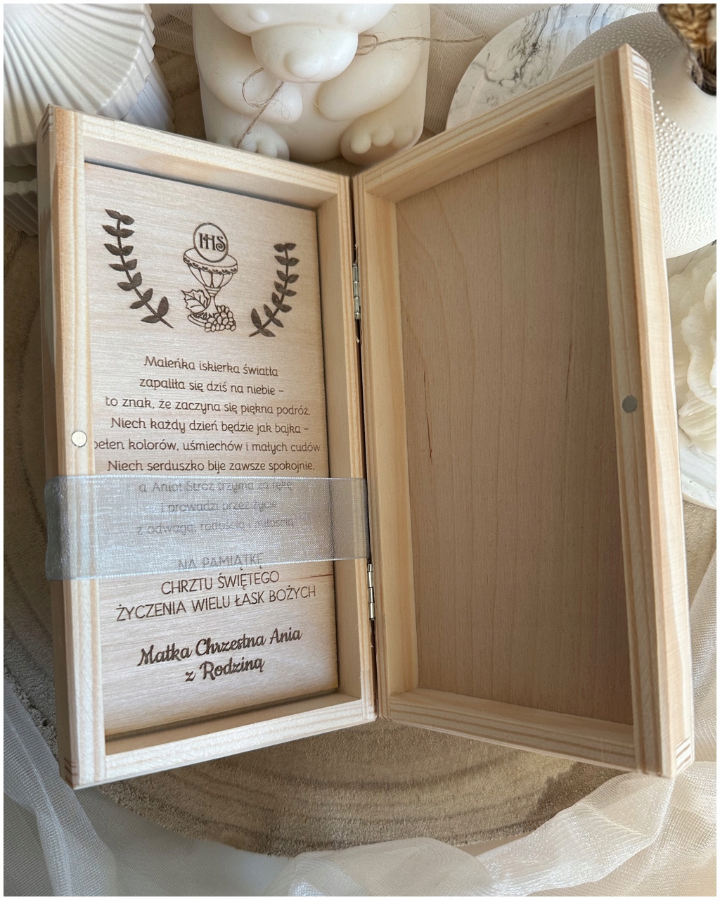 сувенір Святого Причастя у вигляді оригінальної дерев’яної коробки - це унікальна ідея для подарунка з нагоди хрещення . Продукт виготовлений з дерев’яної фанери, на якій є розрізаний символ голубів , розташований на золотих, дзеркальному елементі .