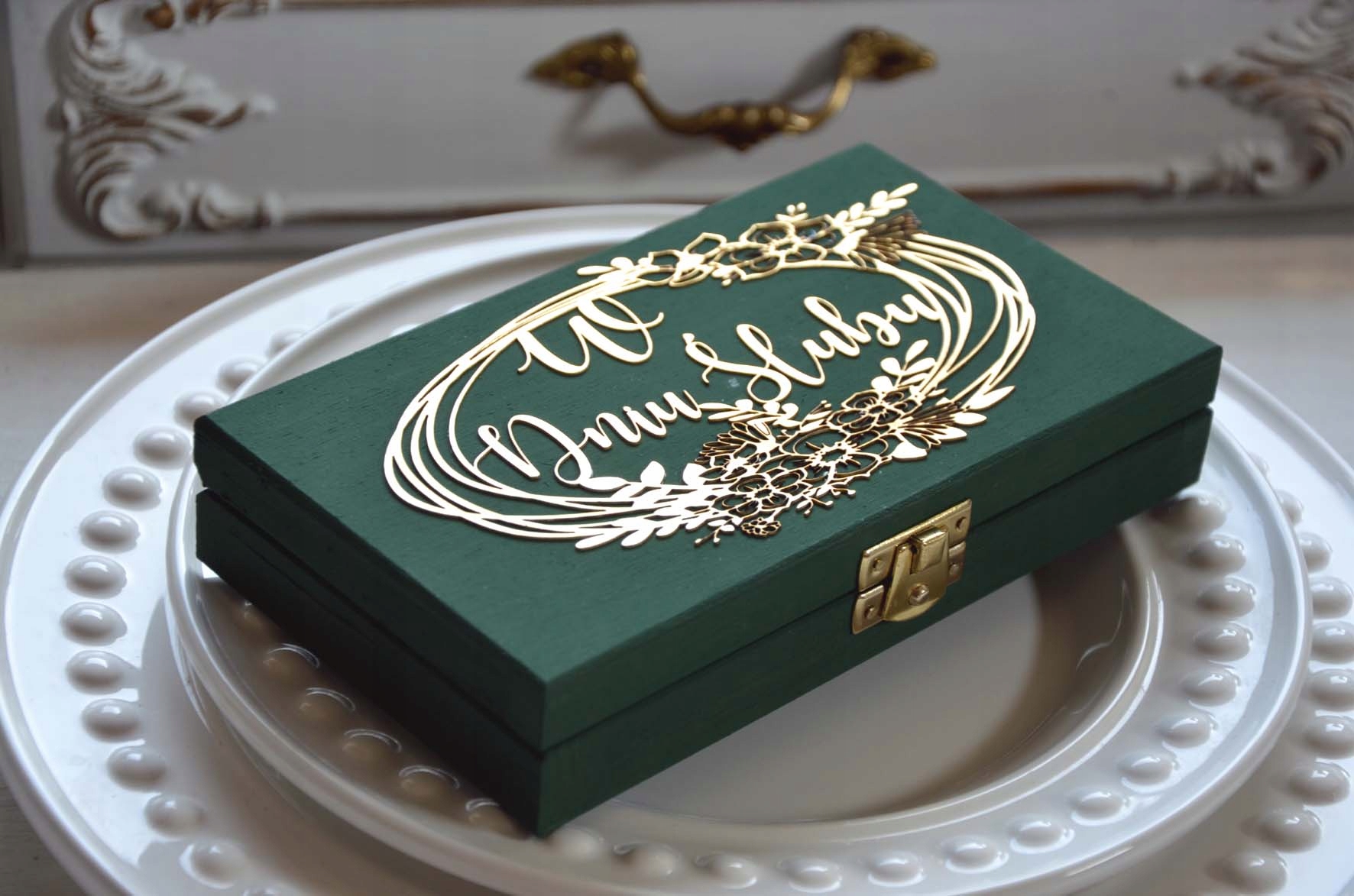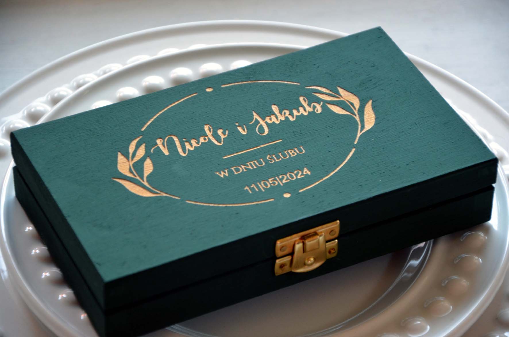 ✔️ Гравірування на кришці коробки з іменами нареченої та датою весілля або золотий перманентний вінок з написом "W wedding day",