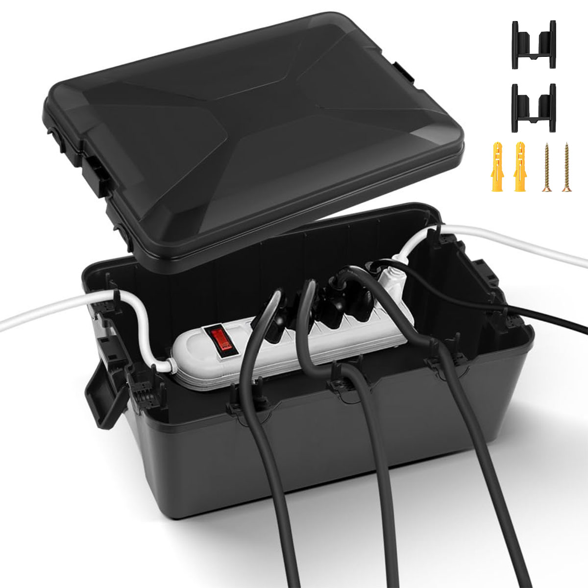 7 входів і виходів кабелю (3 спереду і 4 збоку) забезпечують достатню потужність. Великий розмір блоку живлення (32 х 21,2 х 13,2 см) вміщує багато популярних подовжувачів, таймерів, подовжувачів та інших подовжувачів. Інноваційне закриття коробки легко відкривається.