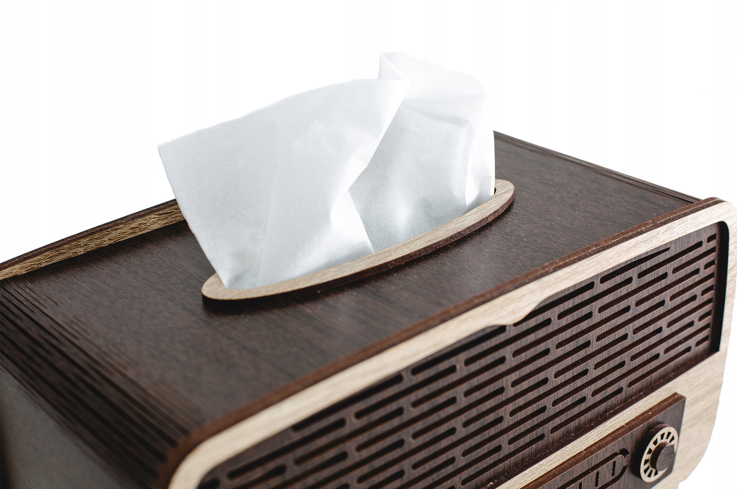 Контейнер для серветок із шпонованої HDF плити у формі ретро-радіо.