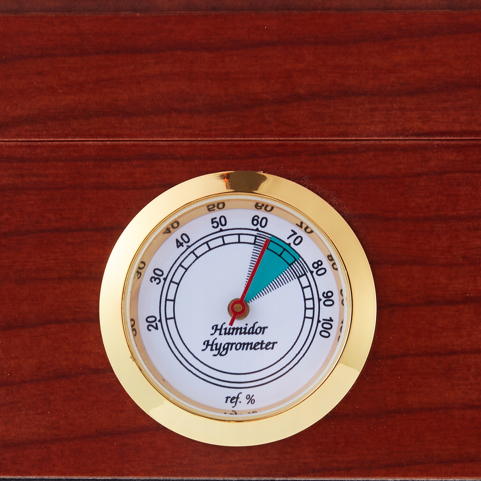 Оснащений високоточним гігрометром, у разі нестачі вологості ви можете просто додати до зволожувача сигарний зволожувач або дистильовану воду, щоб підтримувати вологість коробки, таким чином уникаючи втрати смаку через низьку вологість і цвілі, а також утворення комах, спричинених надмірною вологістю.