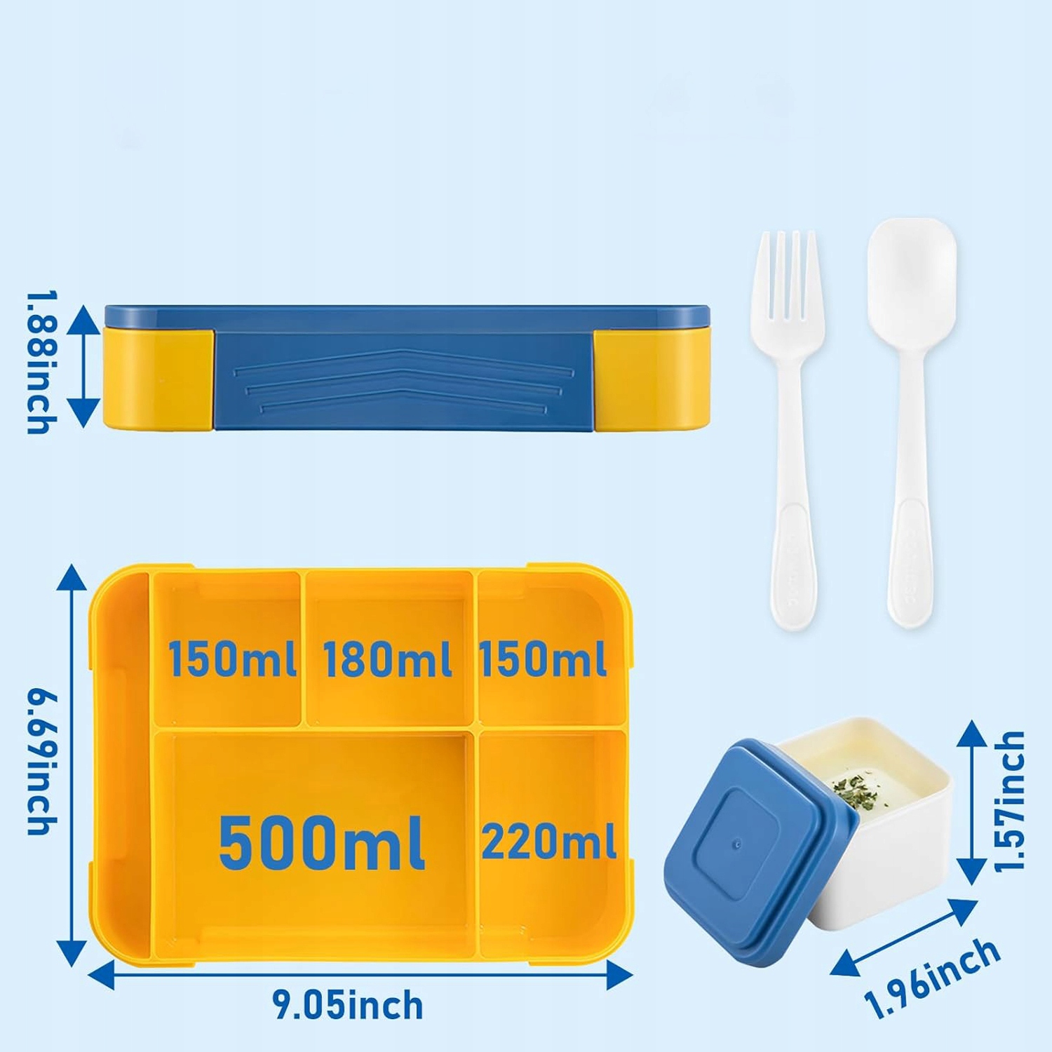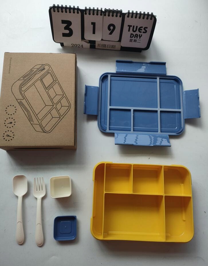обідня коробка для дітей, що містять 1300 мл з відсіками, з 5 відділеннями та незалежними контейнерами для соусів, що вмістить основні страви, фрукти, закуски, салати, пісочники та продажі відповідно. Стійке харчування та контроль за розподілом їжі.