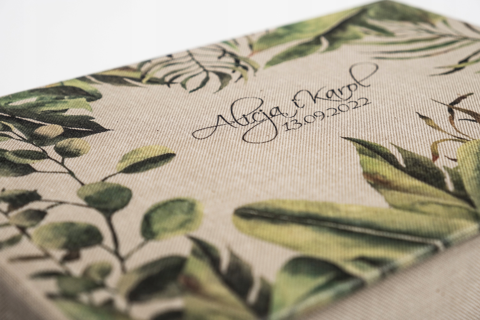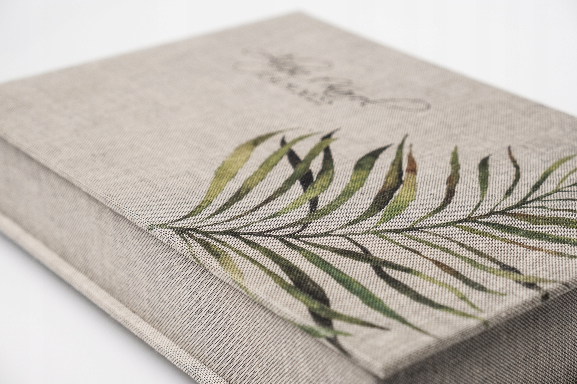 - Внутрішня частина: палітурна тканина в колір натуральний льон + кришка з полотна або паперу, обраного для друку + атласна стрічка для легкого зняття відбитків