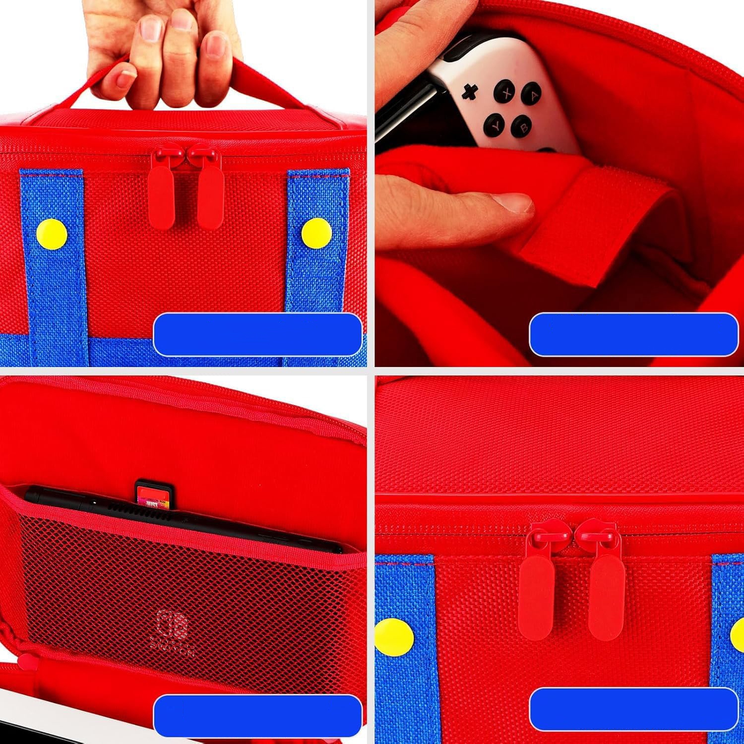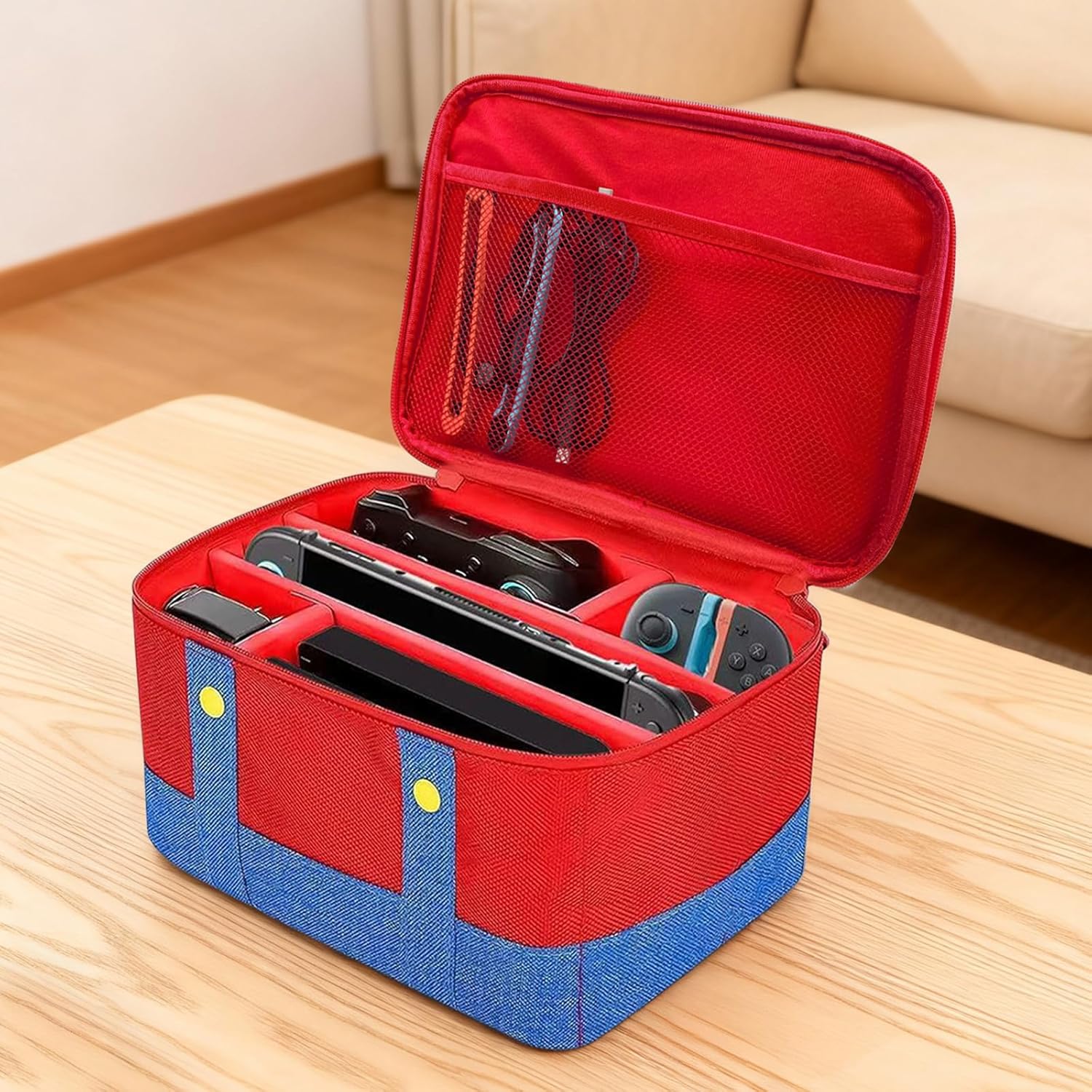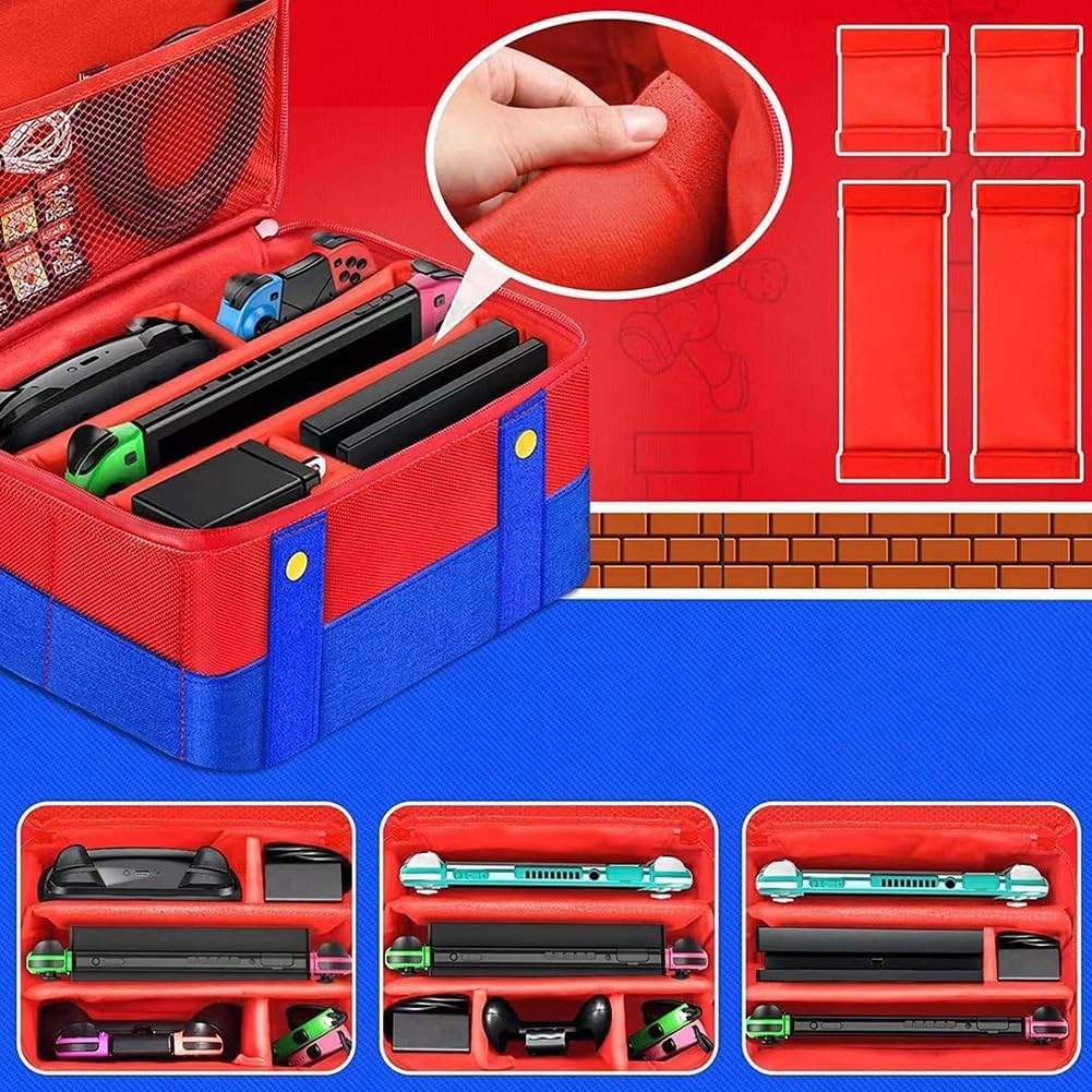 ✅✅✅[Стильний і унікальний] Наш дорожній чохол має яскраву червоно-синю кольорову гамму, натхненну популярними ігровими персонажами, що додає вашому спорядженню стильного відтінку. Він не лише захищає та впорядковує аксесуари для вашої ігрової консолі, але й підкреслює вашу індивідуальність, роблячи його ідеальним для щоденного використання чи довгих подорожей.
