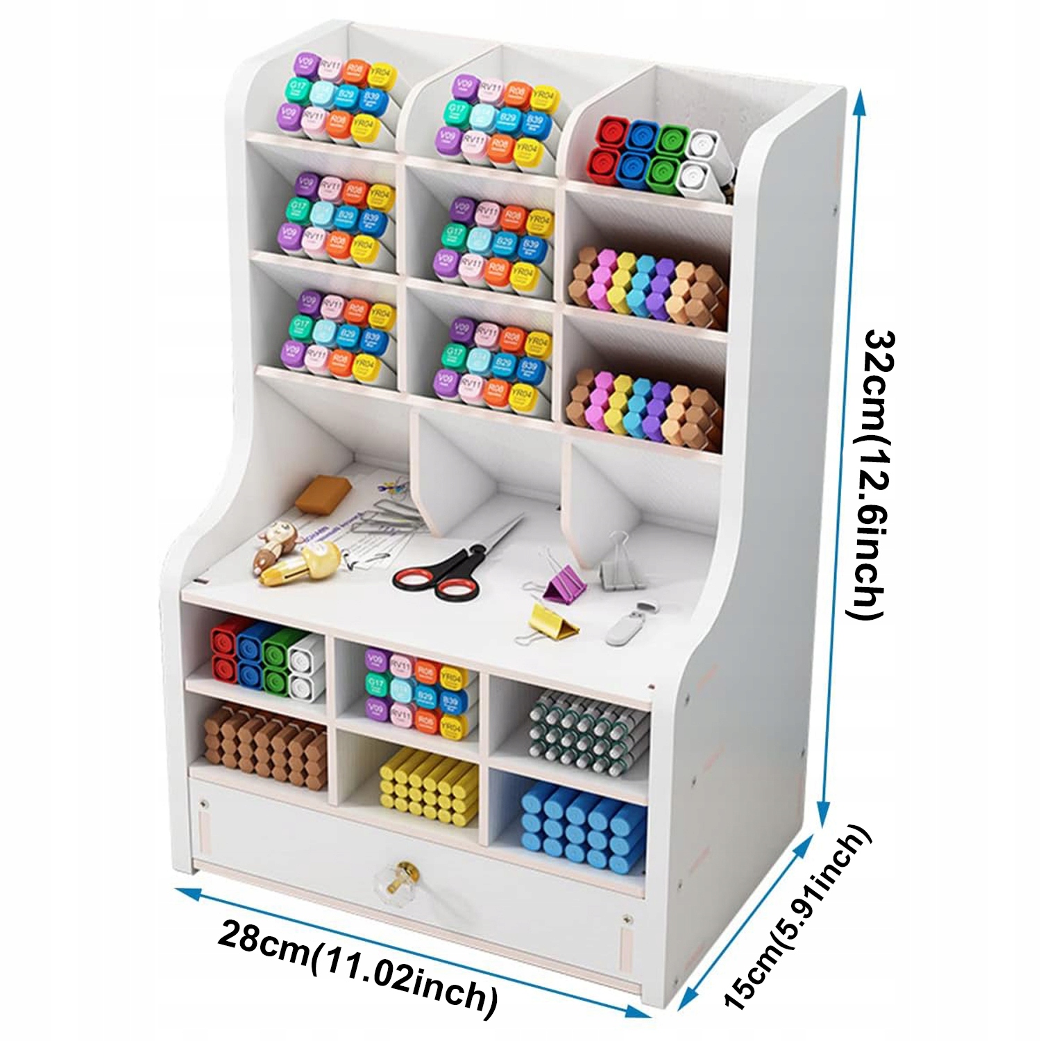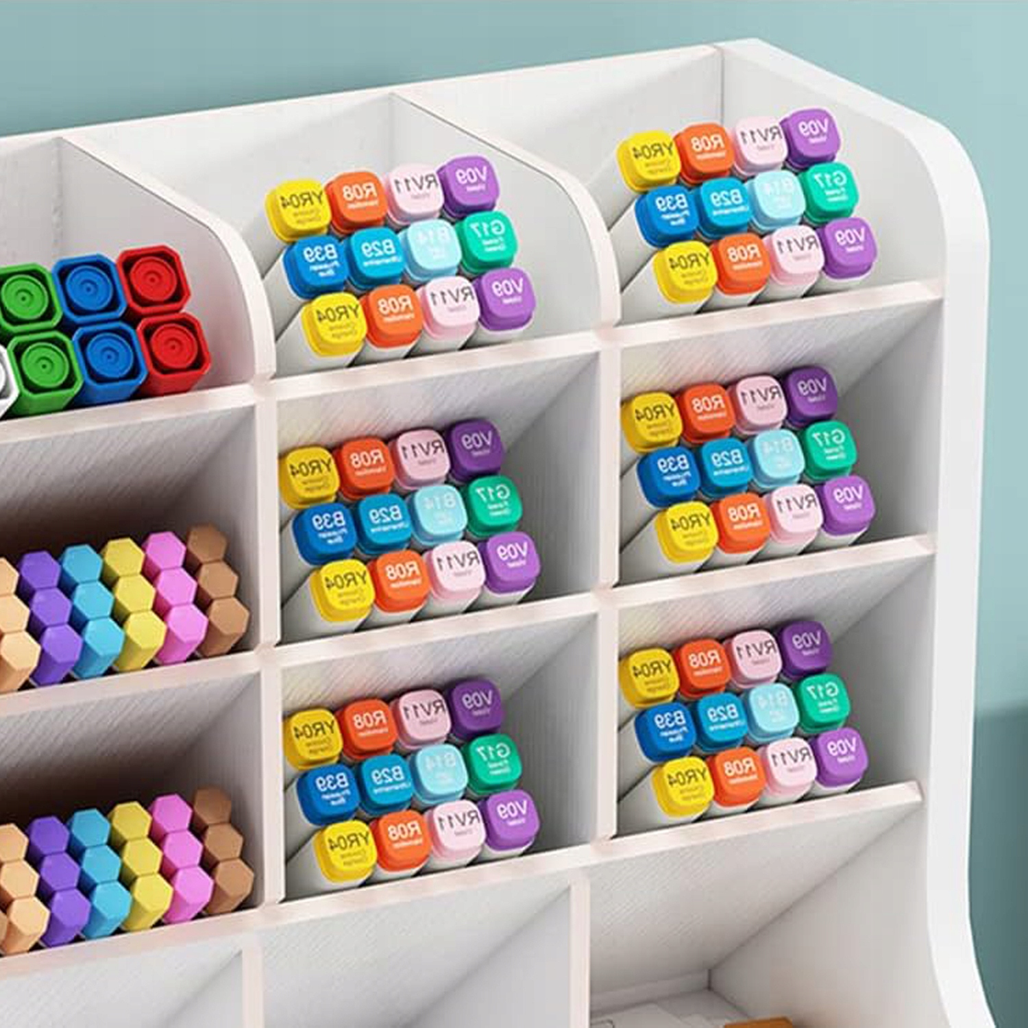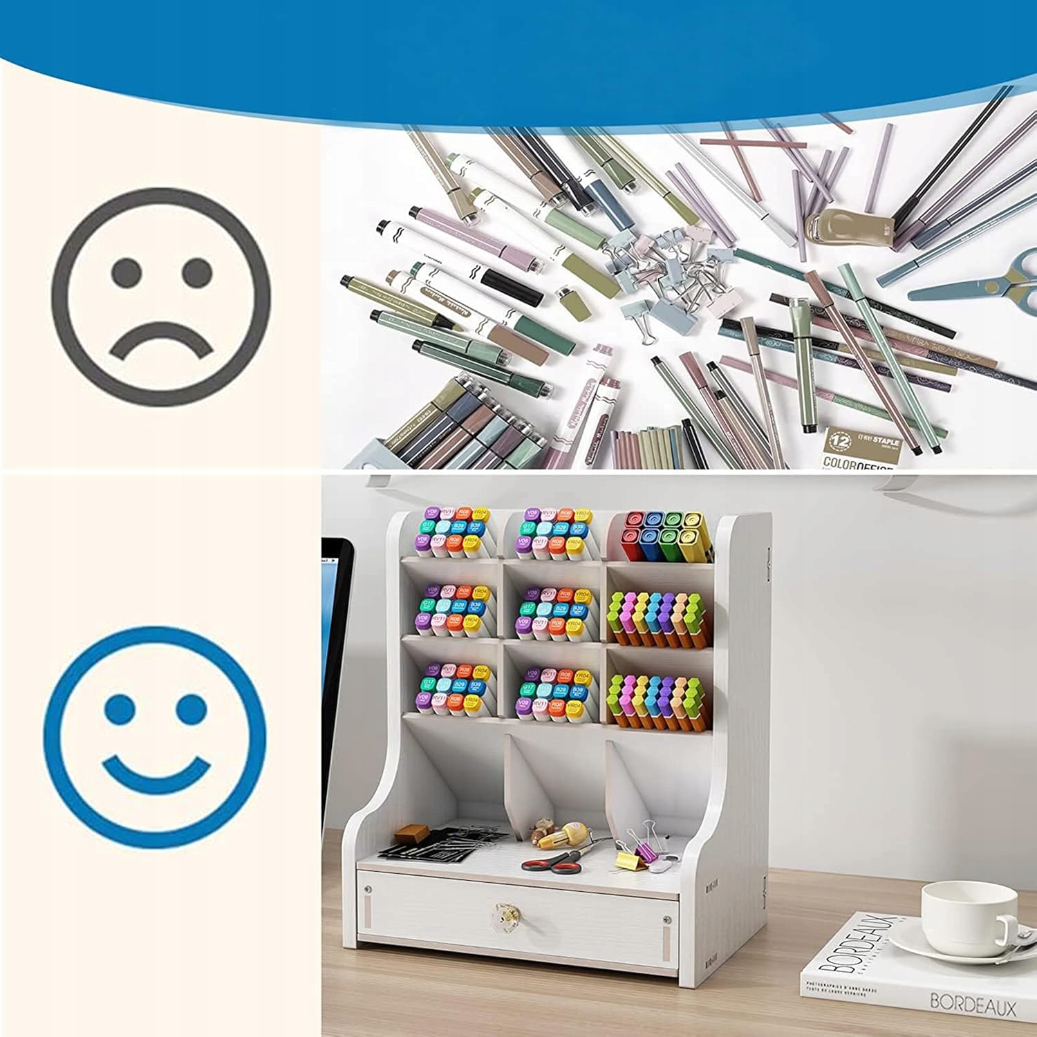 - Просторий дизайн (18 невеликих відділень + 1 шухляда) вміщує письмові інструменти, канцелярське приладдя та дещо більші речі (калькулятори, телефони, блокноти) - максимально збільшуючи простір на столі для вчителів, студентів і професіоналів.