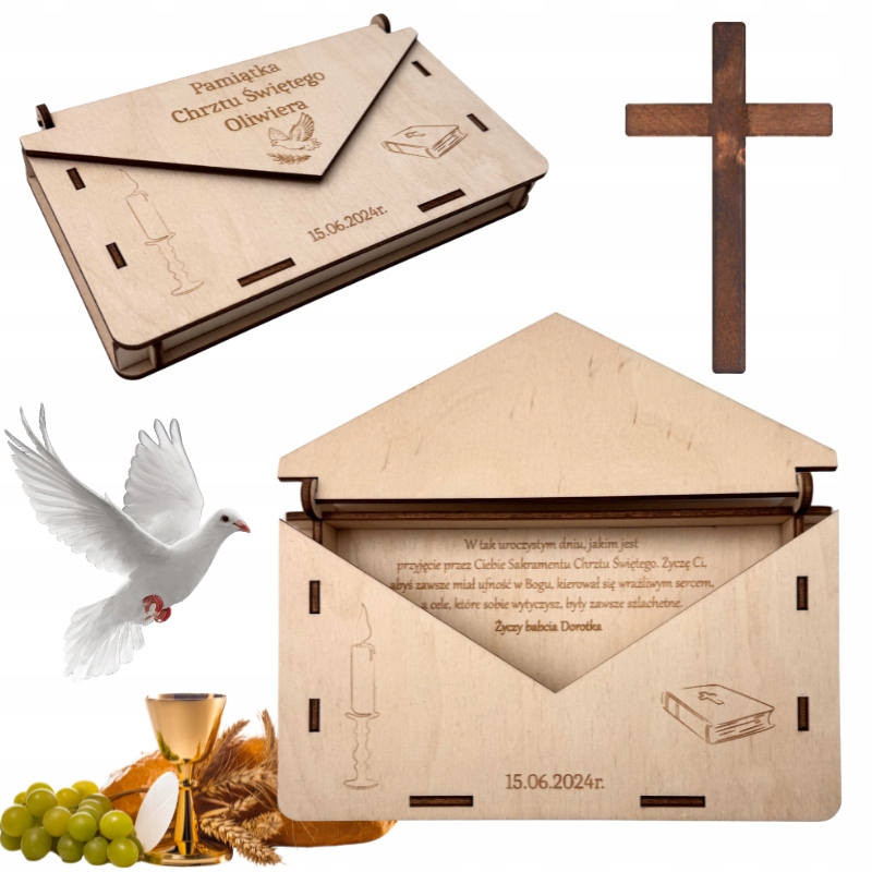 Цей елегантний конверт був розроблений, щоб додати особистий акцент до хрещення хрещення. Виготовлений з високоякісних матеріалів, він довговічний і ідеально підходить для зберігання побажань та невеликих подарунків. Здатність персоналізувати ім'я та дату надає йому унікального персонажа, що робить його прекрасним сувеніром цього важливого дня.