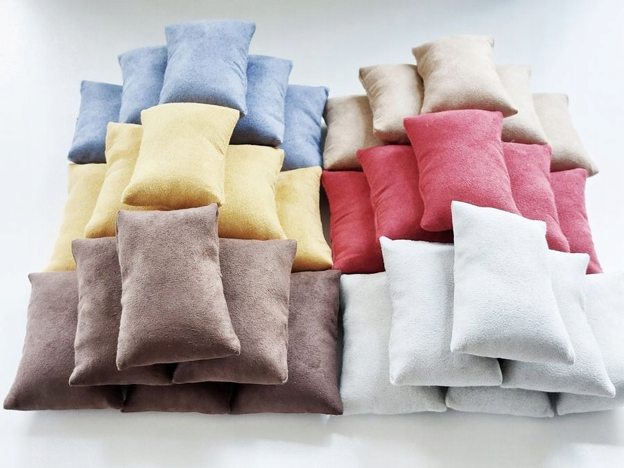 Подушки виготовлені з міцного, міцного оббивного матеріалу (Алькантара) з підвищеною стійкістю до бруду, стирання, вологи та розриву, у темному, шоколадному або жовтому кольорі. Алькантара також приємна на дотик, нагадує оксамит. Подушки гнучкі, тому ви можете застебнути годинники в різних розмірах, на смугах та браслетах. Подушки люблять загубитися, саме тому один додатково додається.