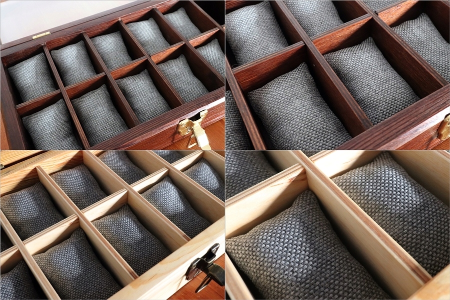 Подушки виготовлені з міцного, довговічного оббивного матеріалу з підвищеною стійкістю до бруду і розривів, кольору натуральний, бежевий льон. Вони гнучкі, тому їх можна використовувати для кріплення годинників різних розмірів, ремінців і браслетів. Подушки часто губляться, тому додається одна.