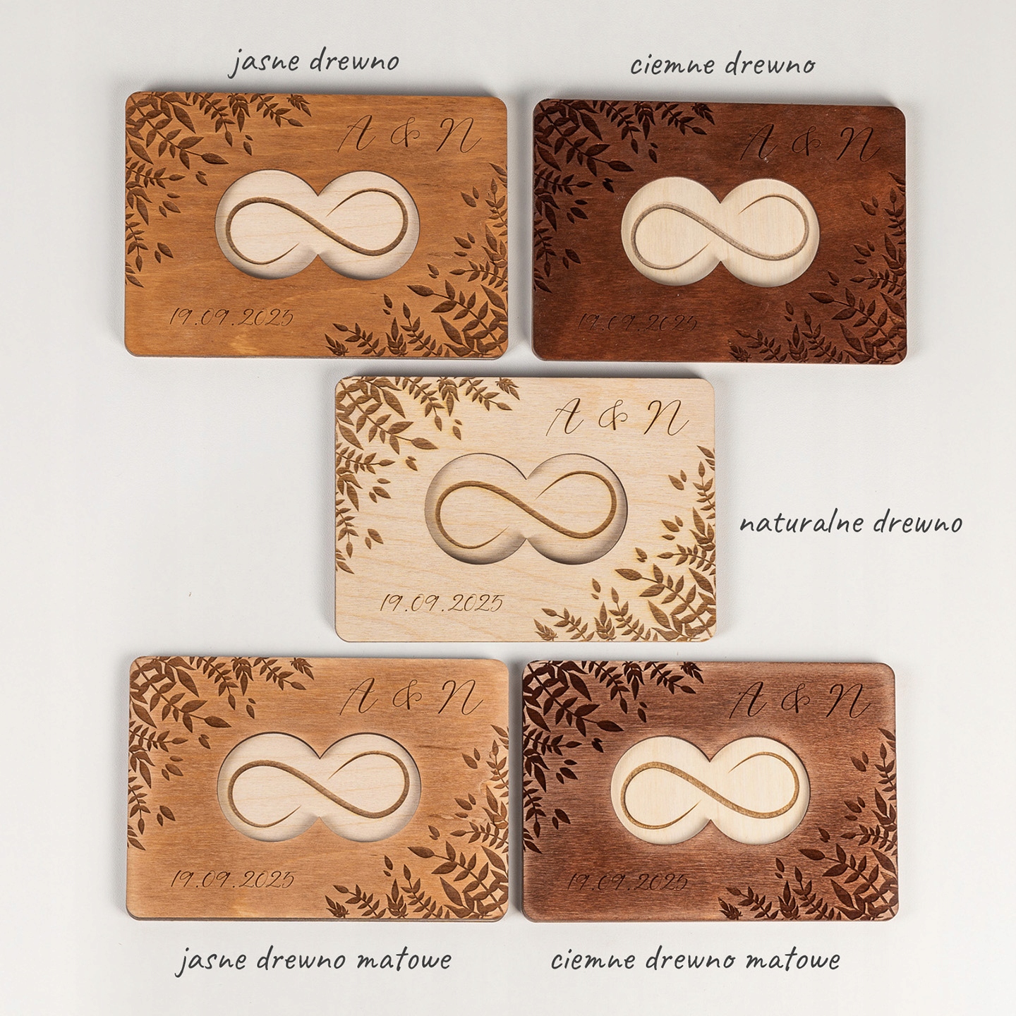 Існує гравірований мотив листів , що символізує розвиток та довговічність відносин, і символ нескінченності з космічним кільцям , які підкреслюють романтичний характер продукту. Ці невеликі деталі додають елегантність і роблять коробку не тільки практичною, але й естетичною. Фанера Brzozowa відрізняється легкістю та витривалою, завдяки чому коробка буде прекрасним сувенірам протягом багатьох років. наявність у декількох кольорах дозволяє відповідати коробці з стилем та темою вашого весілля.