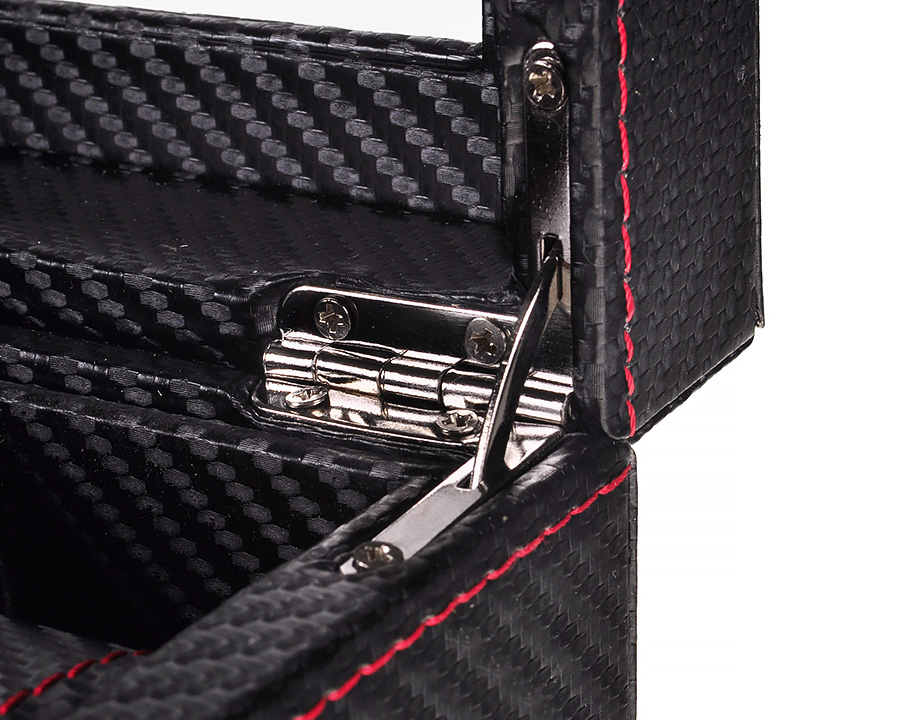 Коробка — ідеальний подарунок як чоловікові, так і жінці. Твердий матеріал ефективно захищає предмети всередині від подряпин і пилу. Структура зовнішнього шару нагадує карбон - коробка чорна, злегка блискуча і дуже приваблива. Шиття червоною ниткою додає елегантності. Сама по собі вона може бути цікавим і привабливим елементом домашнього декору!