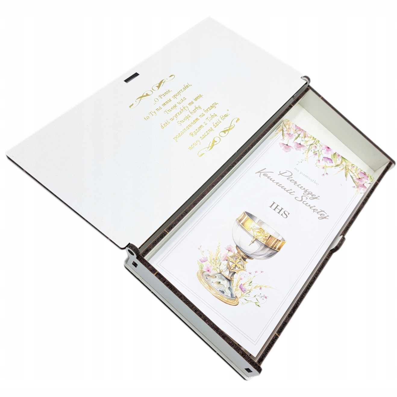 ✔ дерев’яна коробка в білому кольорі з барвистим зображенням хлопчика та написом "сувенір I святий причастя"