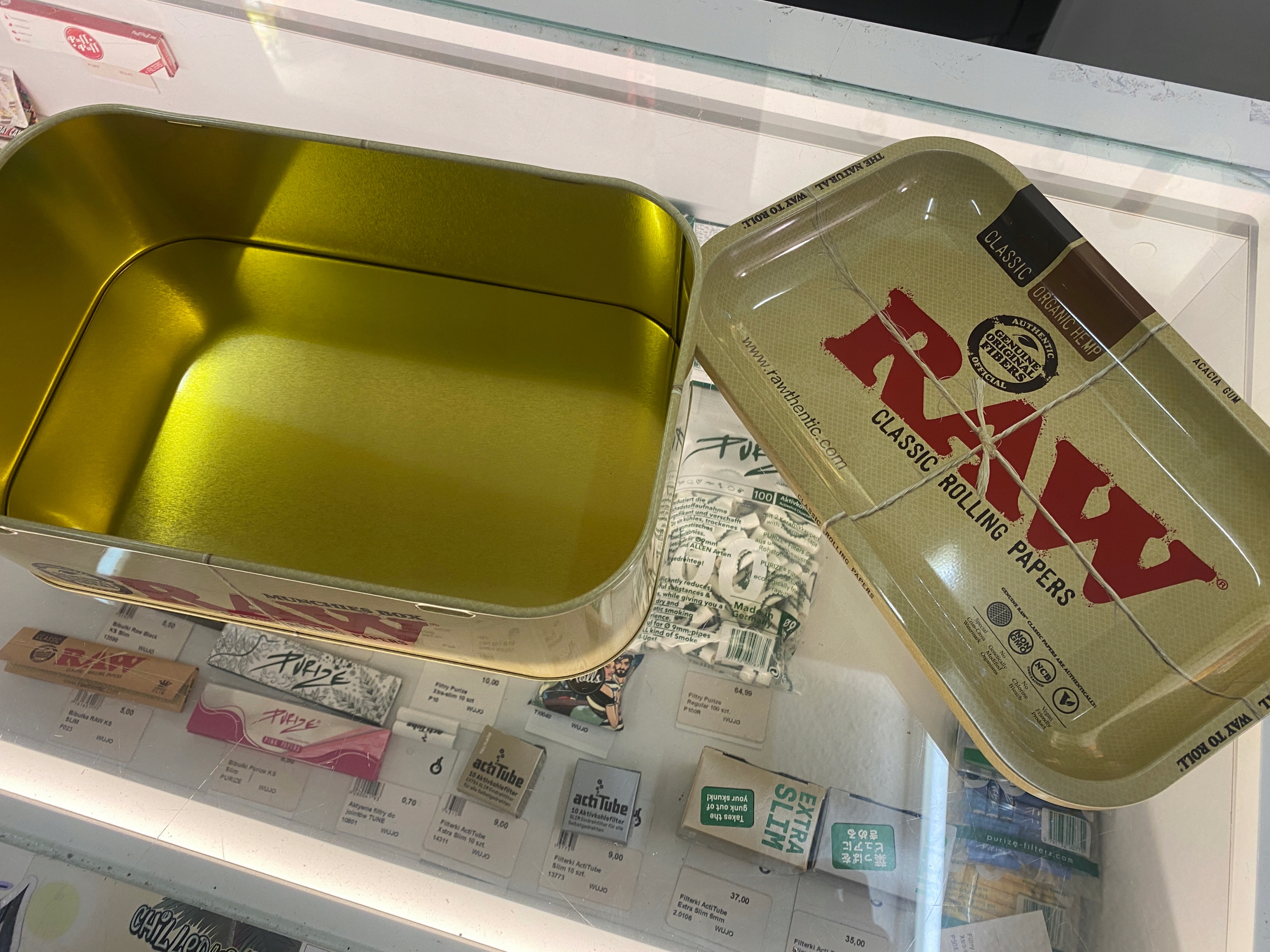 Коробка RAW Munchies Box має унікальний дизайн, у якому можна зберігати всі необхідні речі для куріння. У верхній частині коробки є середній лоток, який ідеально підходить для зберігання джойнтів, сигарет або інших аксесуарів для куріння. Цей практичний лоток забезпечує зручне місце для приготування джойнсів або зберігання запасних сигарет.