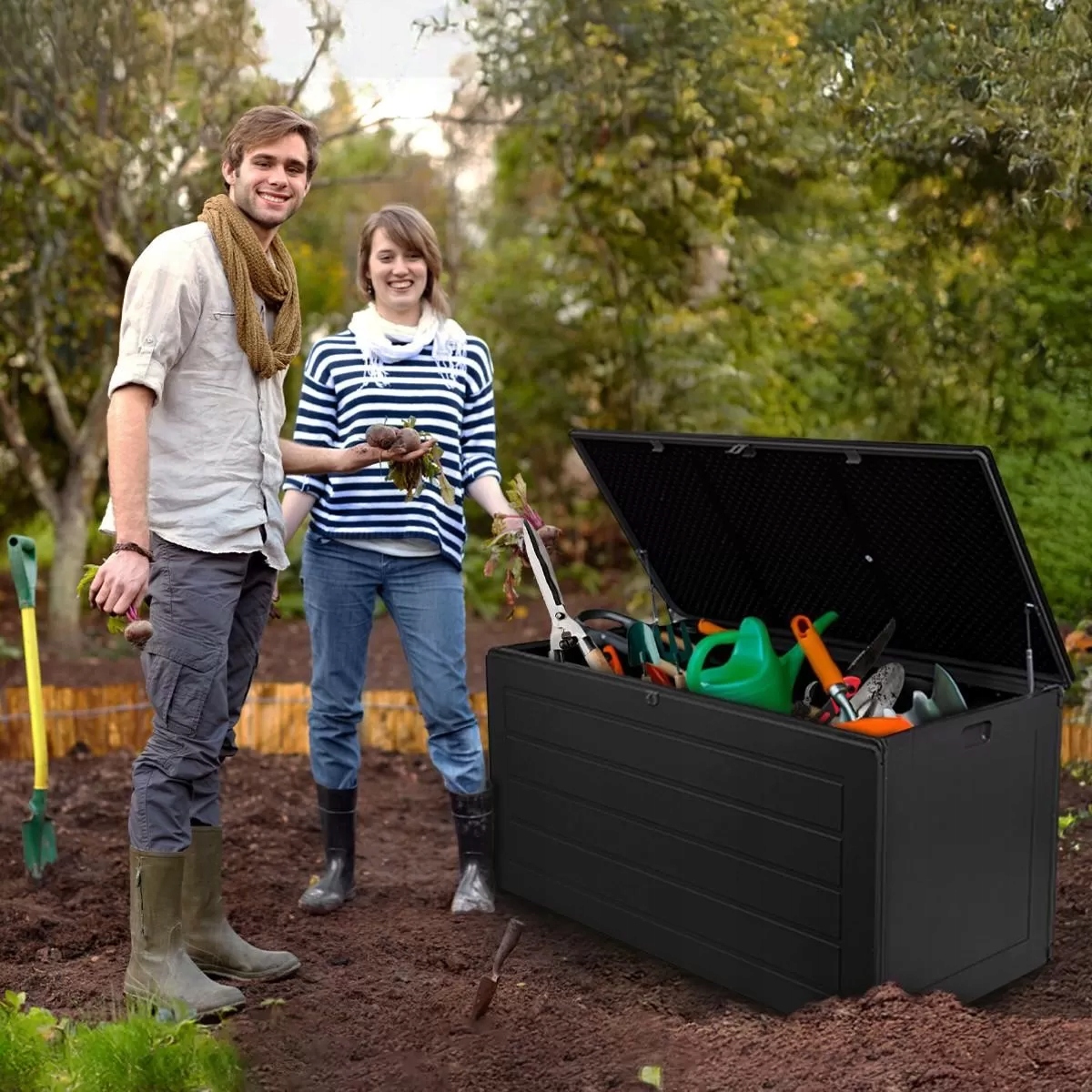 Садовий ящик виготовлений із міцних матеріалів, стійких до атмосферних впливів, що робить його водонепроникним і морозостійким. Він ефективно захищає речі, що зберігаються, від дощу, снігу та низьких температур, забезпечуючи їх збереження протягом усього року. Ідеальне рішення для саду, тераси чи балкона.