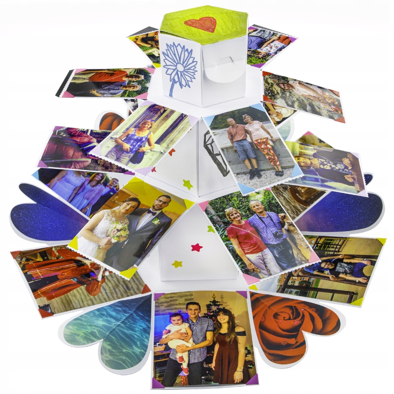 Exploding Box — чудова альтернатива звичайним фотоальбомам. Коробка виглядає як велика квітка, ви вирішуєте, як її прикрасити.