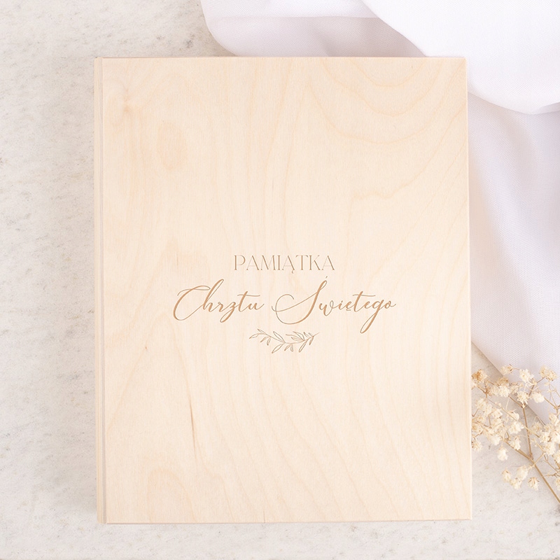 Коробка виготовлена зі світлого натурального дерева, що надає їй елегантності та позачасового характеру. У верхній частині коробки є напис «Сувенір Святого Хрещення» та ніжна графіка сплячої дівчини, яка додає всьому шарму та витонченості.