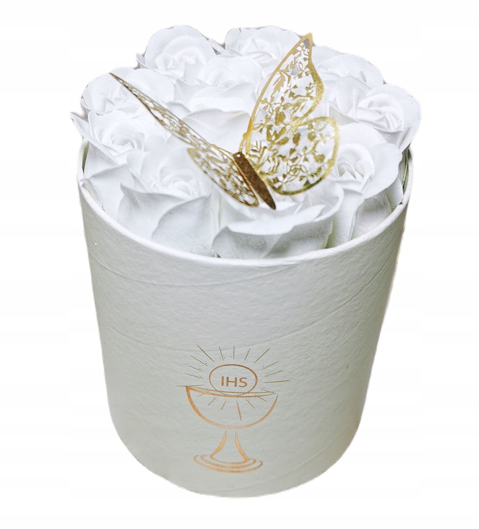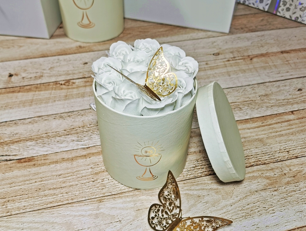 Квіткова коробка з принтом IHS, наповнена ароматним милом у формі троянди, повітряна куля з гелієвої фольги, сувенірний диплом і золотий метелик.