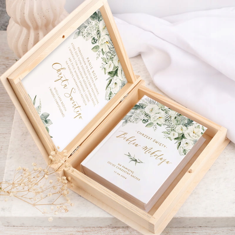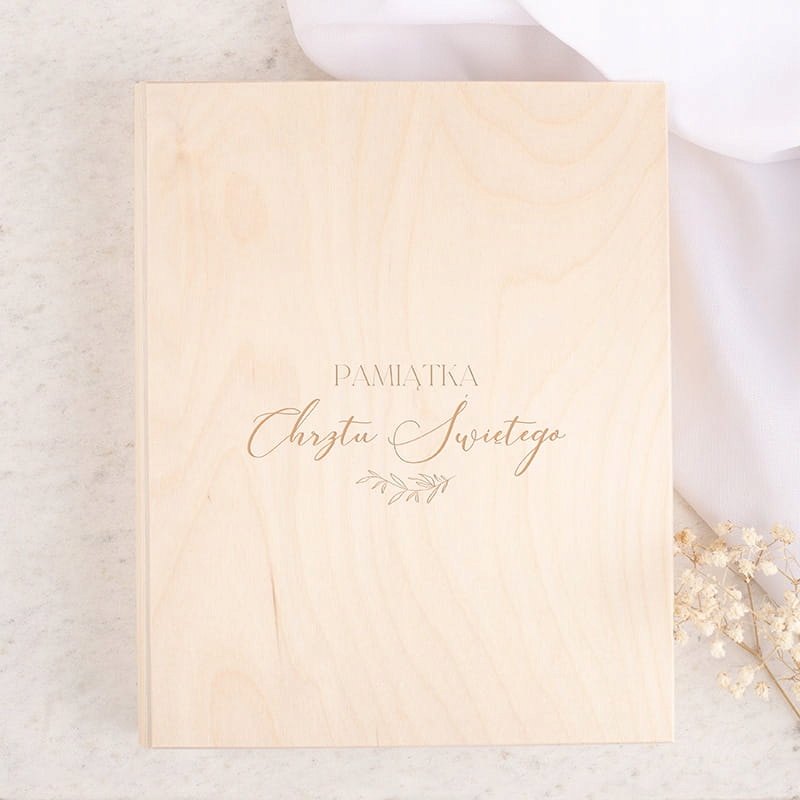 - Дерев'яна коробка виготовлена зі світлого та натурального дерева. Зовнішній вигляд нагадує книгу, що відкривається, кришку прикрашає напис «Сувенір Святого Хрещення» та графіка листків. Усередині скрині ми розмістимо декоративну картку з персоналізацією: