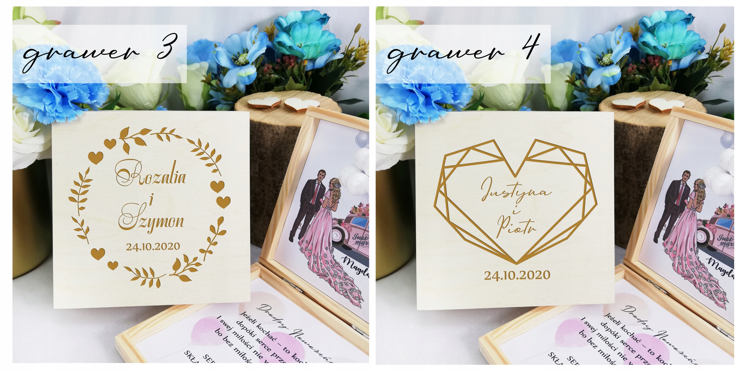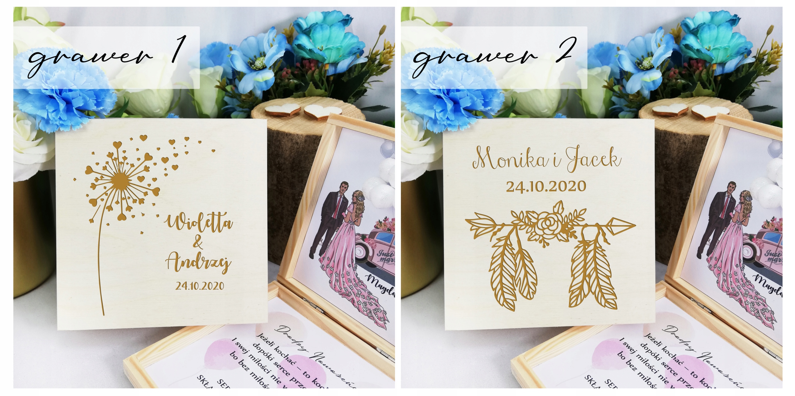 - гравіювання у верхній частині коробки з іменами молодят та датою весілля