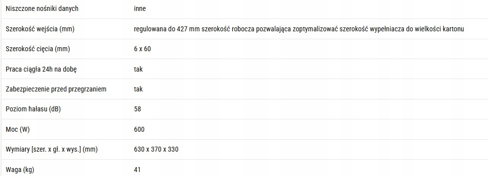 - ширина входу: регулюється до 427 мм робочої ширини, що дозволяє оптимізувати ширину наповнювача відповідно до розміру ящика