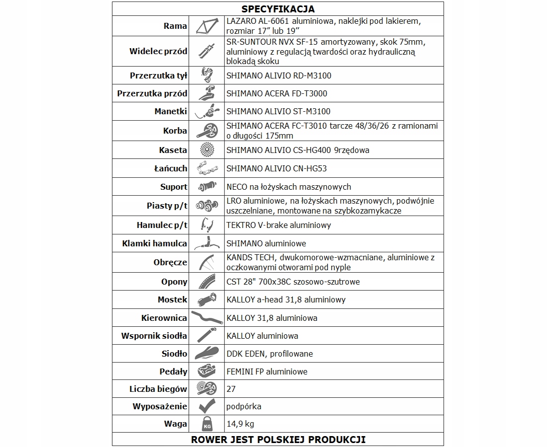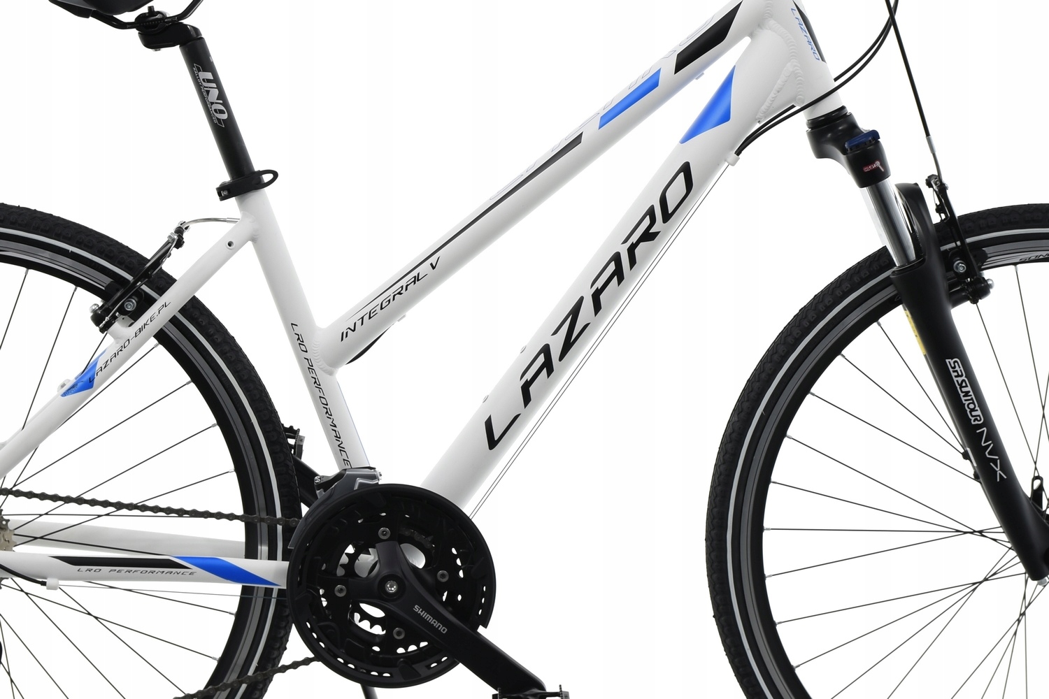 Велосипед Lazaro INTEGRAL V3 — це модель кросу, тобто поєднання універсальності та геометрії трекінгового велосипеда та більш агресивного стилю гірських велосипедів. Ця модель дебютувала в 2009 році. Його оцінили широкі кола велосипедистів. Це буде хорошим вибором для людей, які цінують універсальність і комфортність пересування в міських умовах і поїздках за місто по грунтових дорогах. Легка і міцна алюмінієва рама з геометрією, що дозволяє прийняти зручне положення. Великі алюмінієві колеса діаметром 28 дюймів на міцних двокамерних ободах KANDS TECH (з високим конусом 25 мм!) і втулках LRO з картриджними підшипниками. Шини з дорожнім і гравійним протектором добре працюватимуть на асфальтованих поверхнях і бічних дорогах. Рама має різьблення для кріплення аксесуарів, таких як: бризковики, пляшка з водою, стійка. Фірмові компоненти приводу від Shimano забезпечать тривалу та безвідмовну роботу та безпроблемне перемикання передач. Ефективні V-Brake дають вам відчуття безпеки та контролю під час подорожі. Якщо ви шукаєте універсальне обладнання з репутацією та, крім того, дуже хорошим співвідношенням ціна-якість, кросовий велосипед Lazaro є одним із варіантів для вас.