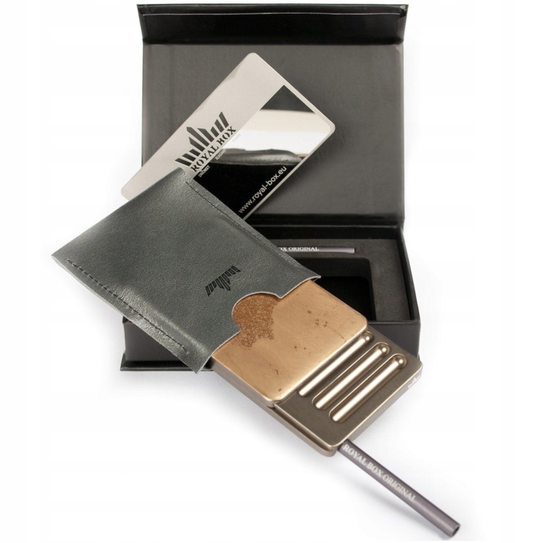 Ексклюзивний і винятково покращений продукт, призначений для зберігання різноманітних вишуканих нюхальних напоїв у стриманий, елегантний і чистий спосіб. Королівська скринька компактного розміру поміщається в будь-який гаманець чи кишеню, як кредитна картка (86 мм x 54 мм x 8 мм).