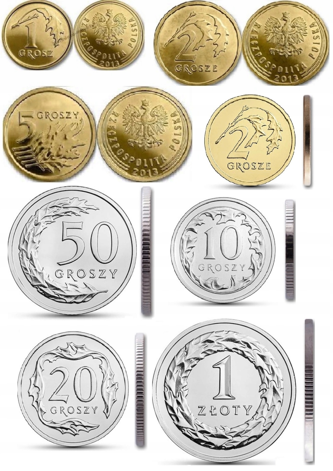 10 грошей, 20 грошей, 50 грошей і 1 злотий