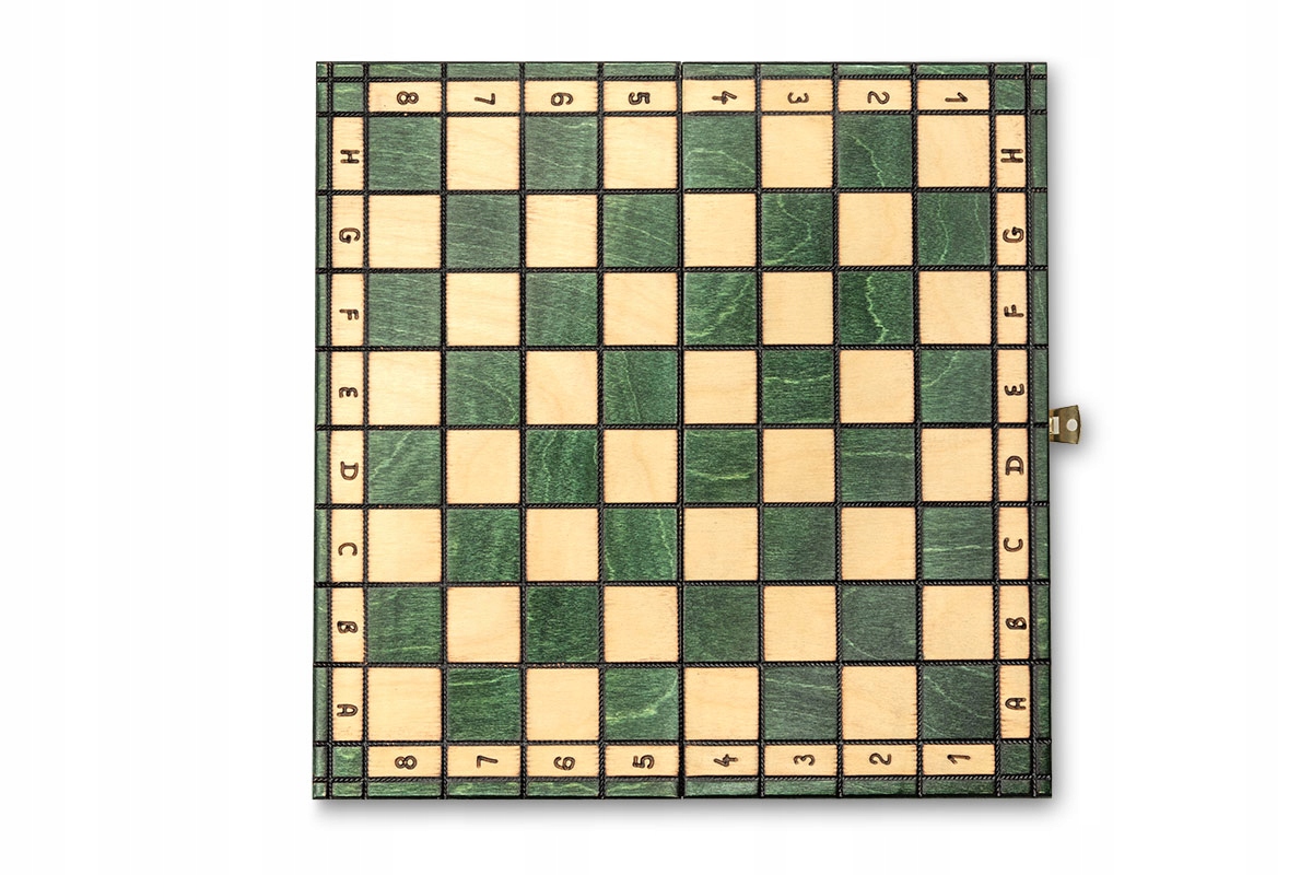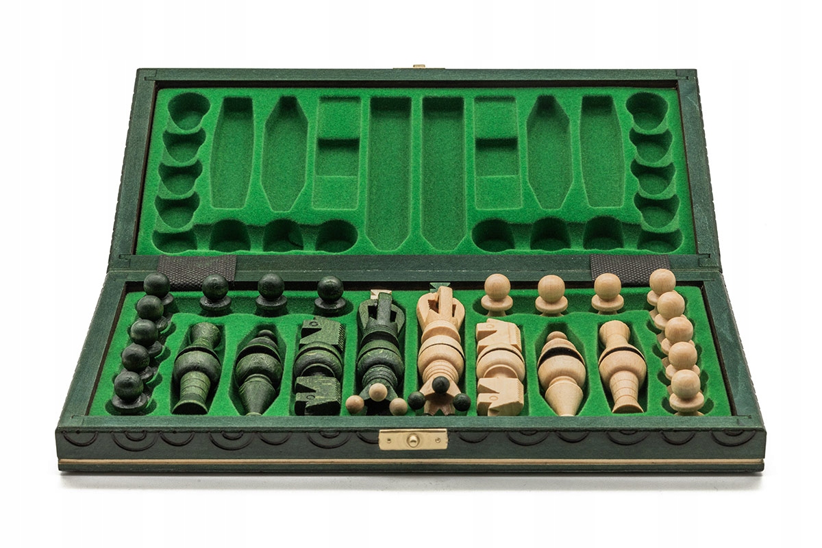 Набір - це касета з шаховою дошкою, набором шахових фігур у білому та зеленому, 16 елементів у кожному.