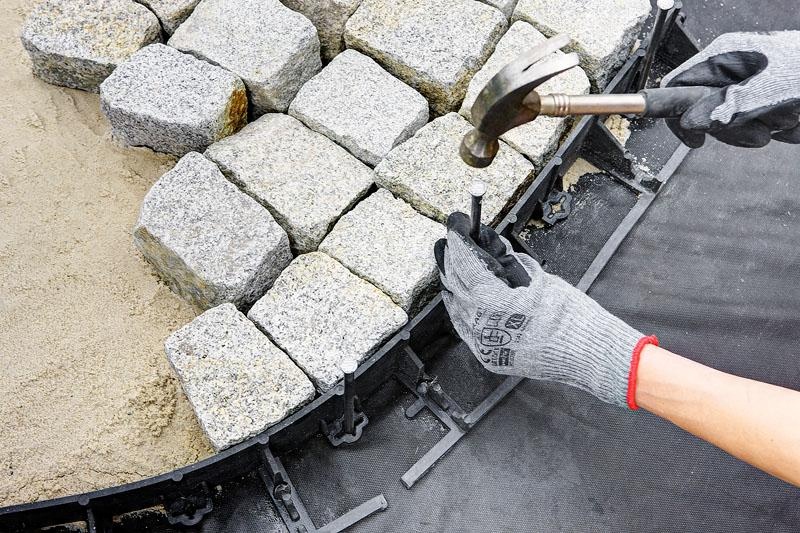 Кріпимо бордюр до землі шпильками або анкерами, забиваючи їх у спеціально підготовлені отвори в бордюрі.