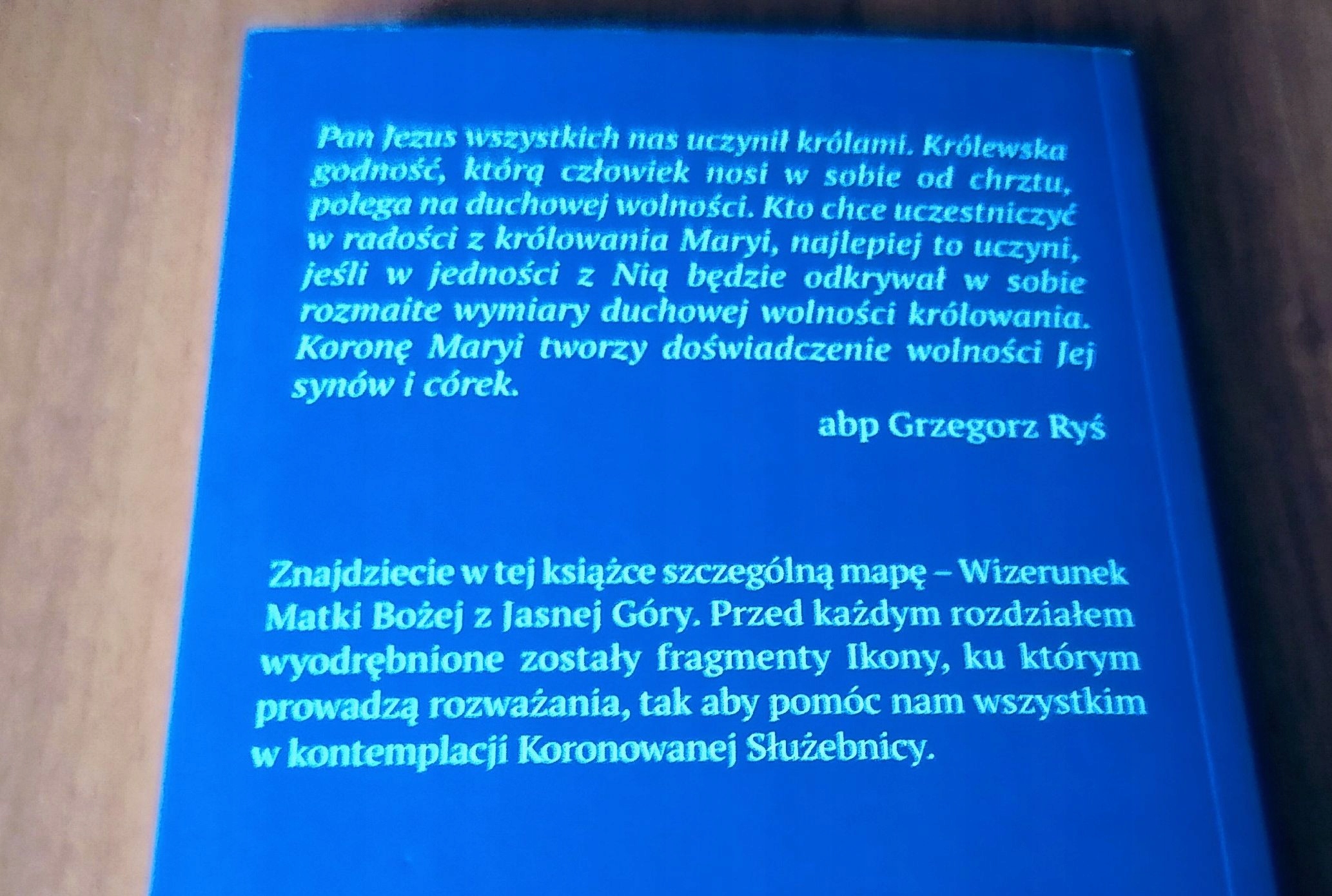 Коронована служба - це колекція вчень Новени, яку проводить архієпископ Грзегоц Рисія в Джасні Гюра. Ці унікальні міркування глибоко євангельські та глибоко людські: "Автор неодноразово дозволяв йому пробити любов, синову ніжність і вірність Матері Божій, яку представляє ікона Джасна Гурра, і до Ісуса Христа, до якого все Джасна Гюра зберігає книгу. Індивідуальні фрагменти ікони, на яку вони розглядають.