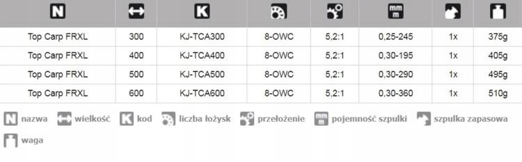 TOP CARP FRXL Багата серія котушок з безкоштовною шпулею, включаючи базову версію FRT і вдосконалену, розкішну FRXL. Версія FRT має суцільний 3-опорний механізм з вижимним підшипником OWC, основною і запасною шпулями з пластику.Версія FRXL являє собою додатково посилену конструкцію з 8 підшипниками - включаючи вижимний підшипник OWC, основну шпулю з дюралюмінію і запасна шпуля з пластику 7 підшипників, 1 запасна шпуля в комплекті: підшипник OWC, алюмінієва шпуля