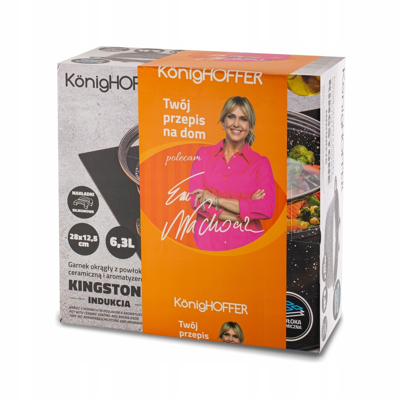Каструля з керамічного каменю Konighoffer Kingstone кругла (об'єм 6,3 л) забезпечить вам високий рівень комфорту під час приготування їжі. Він захистить інгредієнти від пригорання і прилипання. Він буде прогріватися рівномірно і швидко. Це дозволить ефективно тушкувати під кришкою і постійно стежити за процесом приготування страви. Завдяки литому під тиском алюмінієвому корпусу та мармуровому керамічному покриттю зі стійкістю до 10 000 циклів стирання ви отримуєте багато років служби. Це варіант для тих, хто цінує здорову та поживну дієту, наприклад, приготовлену з мінімальною кількістю жиру та гранітною поверхнею. Безпроблемне обслуговування та тривалий термін служби є ще одними основними перевагами придбання цієї моделі. Ви можете використовувати його на всіх типах плит. Також підходить для духовки - без кришки і максимум до 220 градусів С. Каструля продається в комплекті зі скляною кришкою з ароматизатором і 2 силіконовими захисними накладками на ручки. Продукт рекомендований Ewa Wachowicz. Як амбасадор бренду Konighoffer, вона тепло та з усмішкою рекомендує його для домашнього використання. Разом з ним ви отримаєте свій рецепт для дому. Це один із найкращих варіантів у цій категорії!