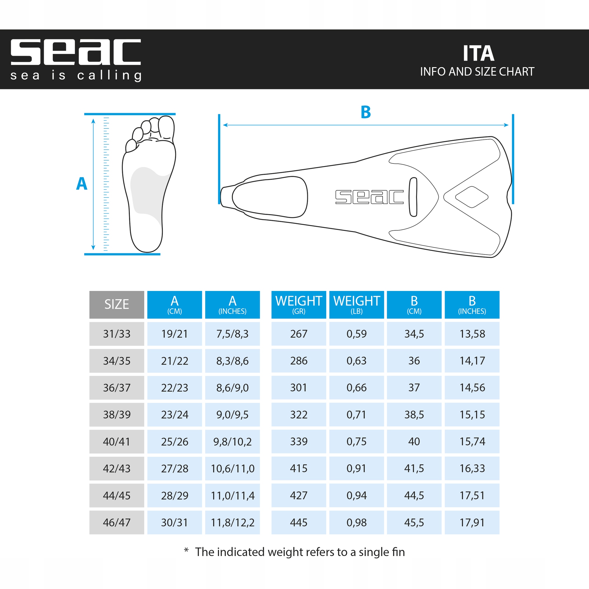 - PEN плавники Seac Ita - це поєднання різних пластикових матеріалів, які гарантують чудову гнучкість для максимальної продуктивності та просування протягом усього циклу удару. Краї та наконечник - гума для захисту плавника від зносу.