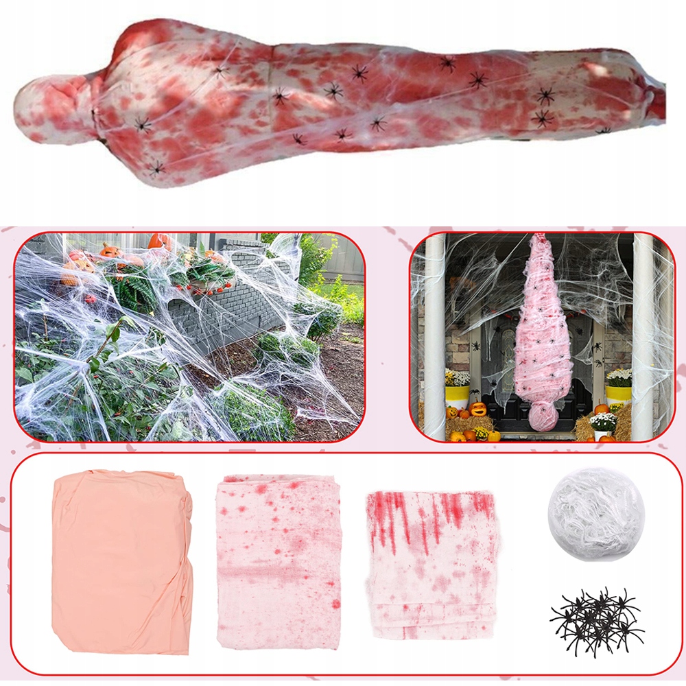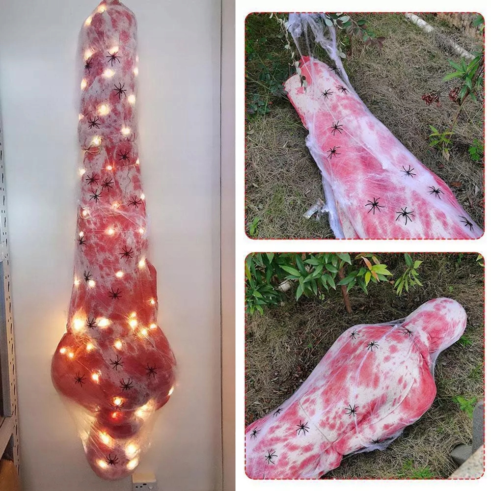Реквізит «Жертва Хелловіну» швидко збирається: просто надуйте опору за допомогою ручного насоса, оберніть тіло та голову смужками тканини та, нарешті, прикрашають павутиною і павуками. Ви можете легко створити моторошний візуальний ефект без будь-яких складних кроків.