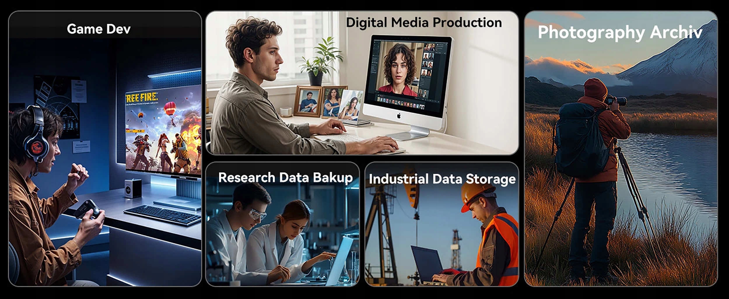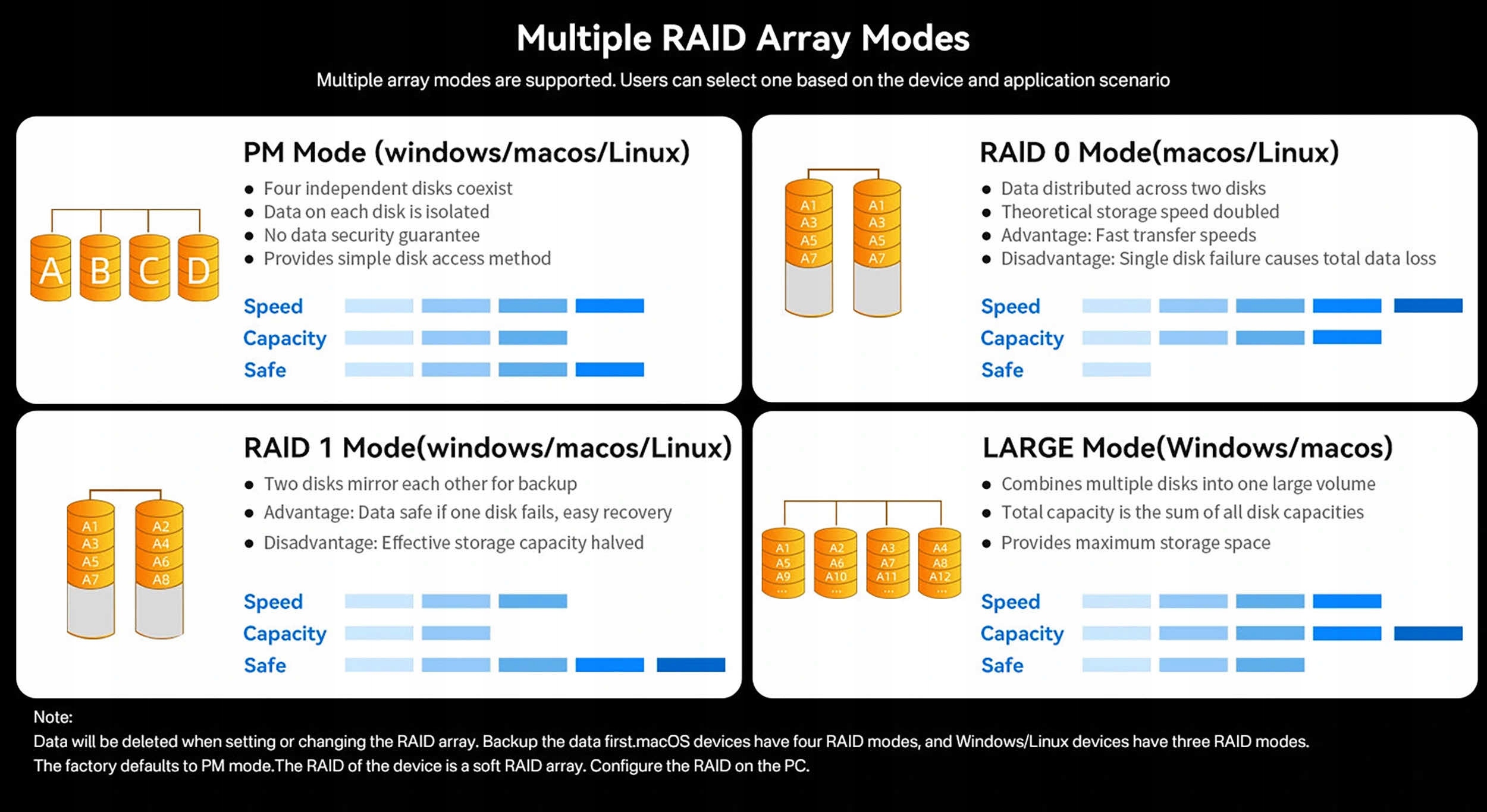 підтримує конфігурацію програми матриці RAID, і кожна перерва може вмістити SSD з ємністю до 8 ТБ. Після підключення чотирьох дисків, більший режим або RAID-0 дозволяє покращити масове зберігання до 32 ТБ, забезпечуючи гнучкі рішення масового зберігання для вирощування даних у галузі даних.